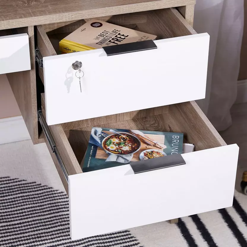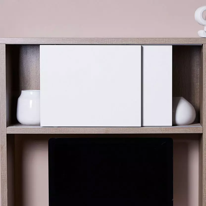 يأتي المكتب مع درجين لتنظيم الأشياء الصغيرة والمهمة، بالإضافة إلى خزانة ببابين انزلاقيين لتخزين آمنة ومنظمة. الأقسام العرضية المفتوحة تضيف لمسة عصرية وتوفر مساحة إضافية لعرض الديكورات الجميلة أو الكتب المفضلة.
