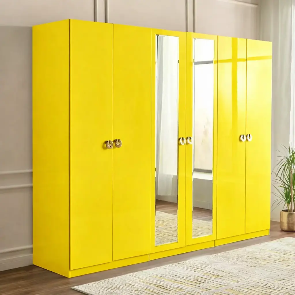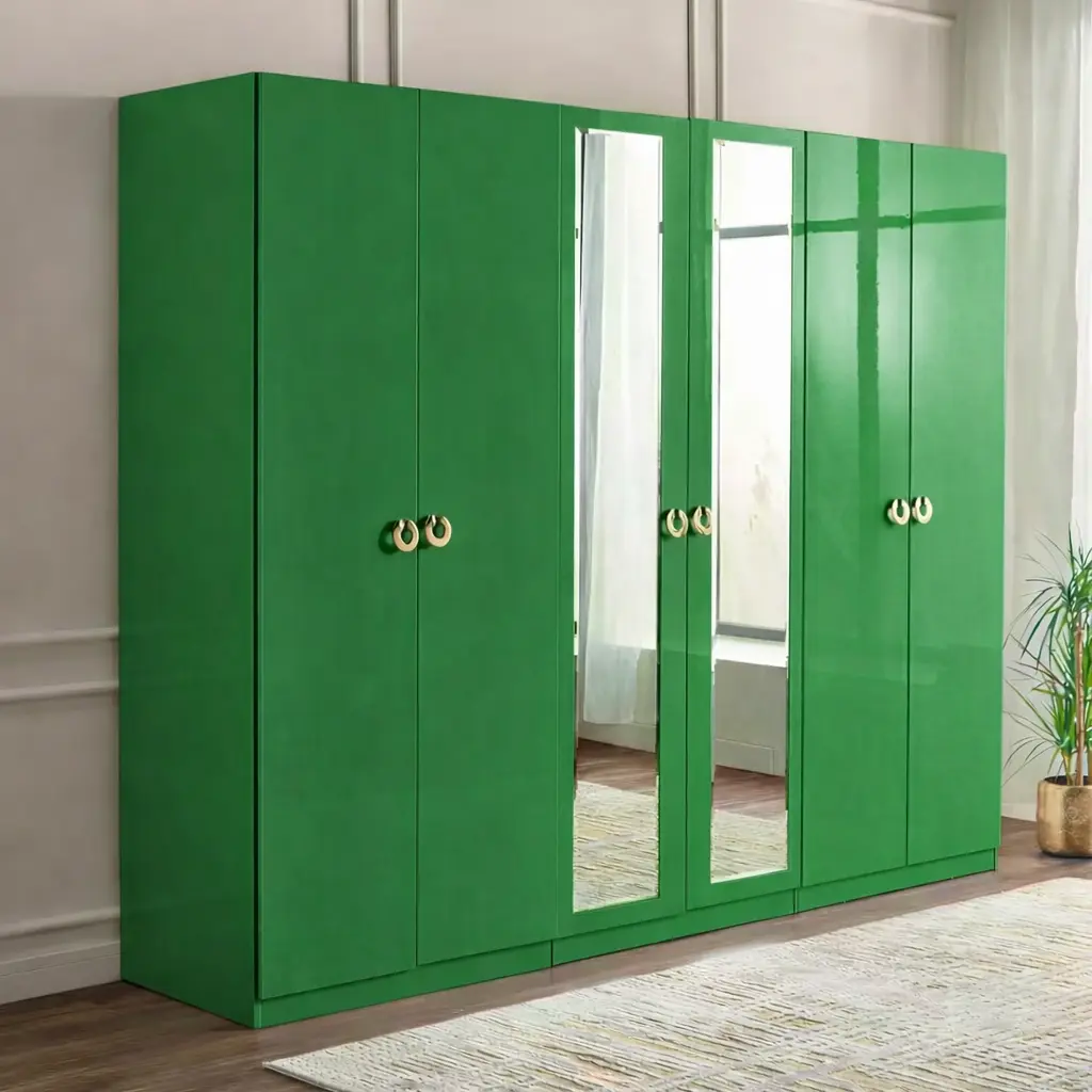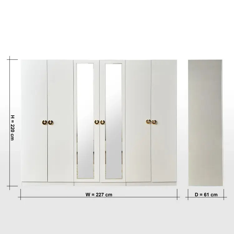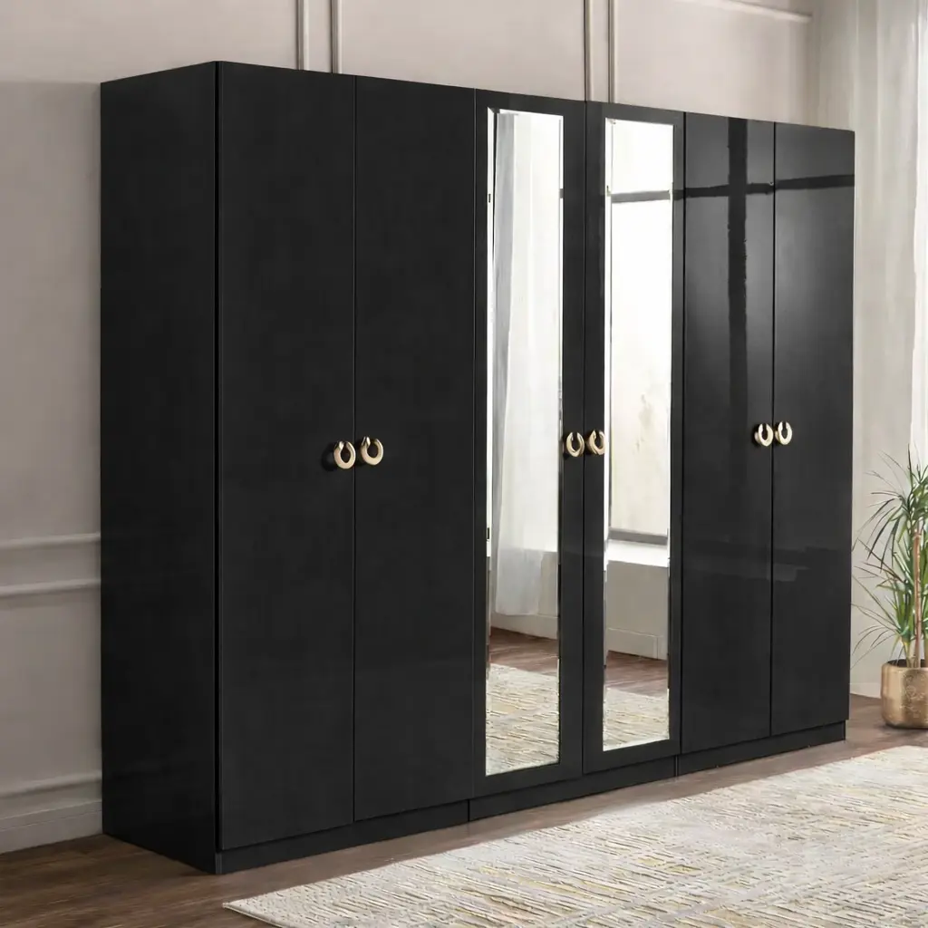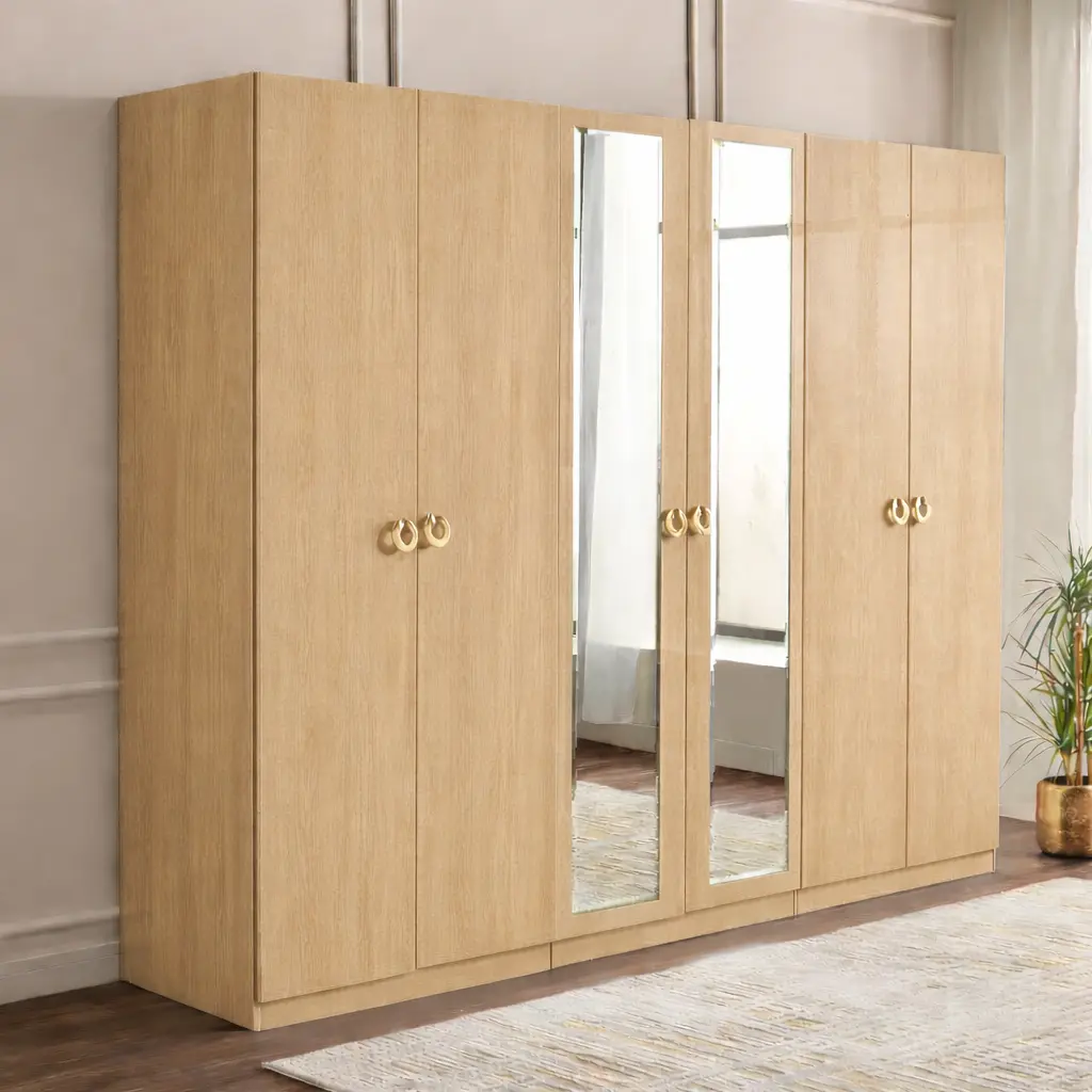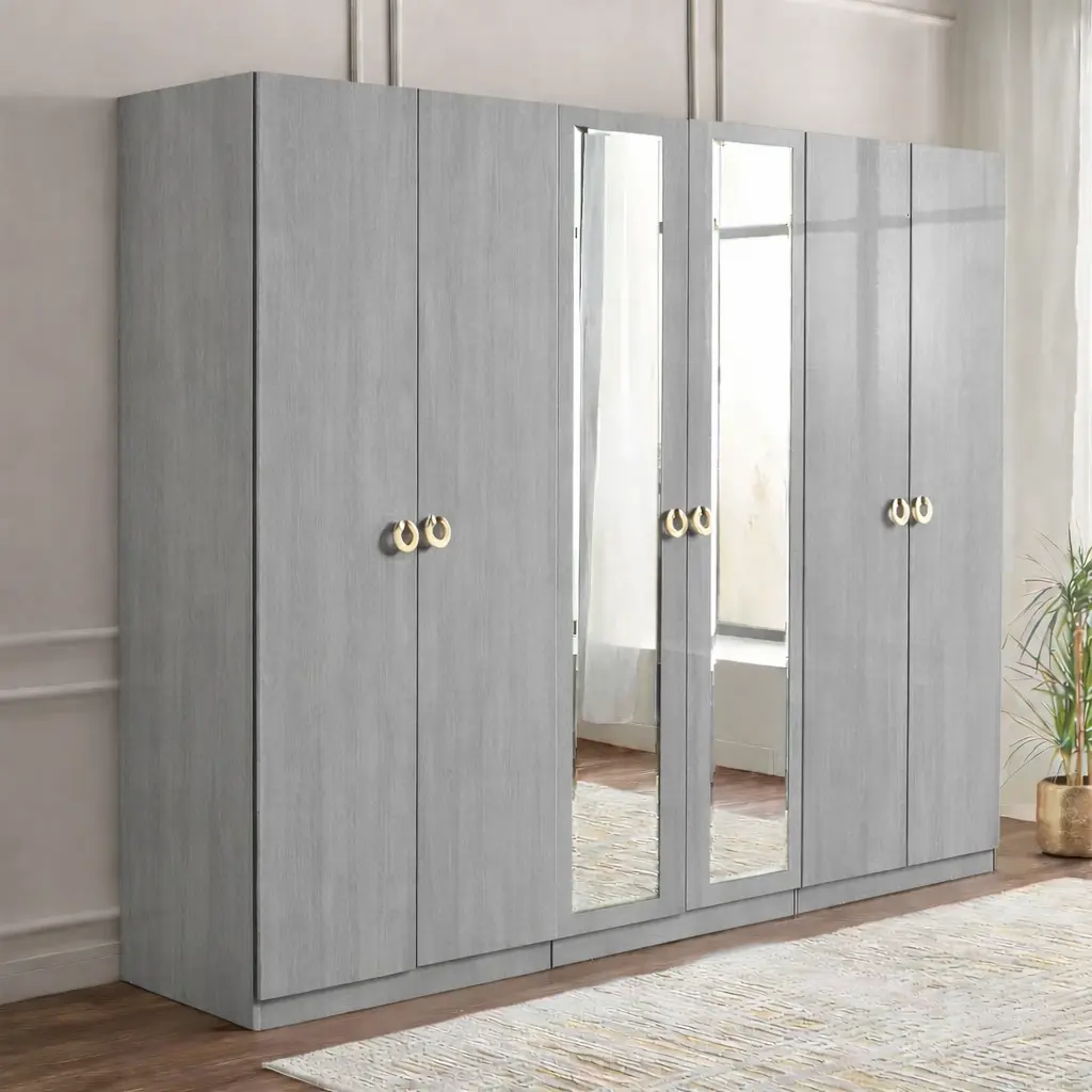 توفر الأبواب المتعددة إمكانية تقسيم الملابس بشكل عملي، سواء للملابس الرسمية أو اليومية، وهو ما يساعد على الحفاظ على ترتيب الغرفة بشكل دائم. كما أن وجود مرايا مدمجة بطول كامل يضيف ميزة عملية تسهل تنسيق المظهر اليومي دون الحاجة لقطع إضافية داخل الغرفة.