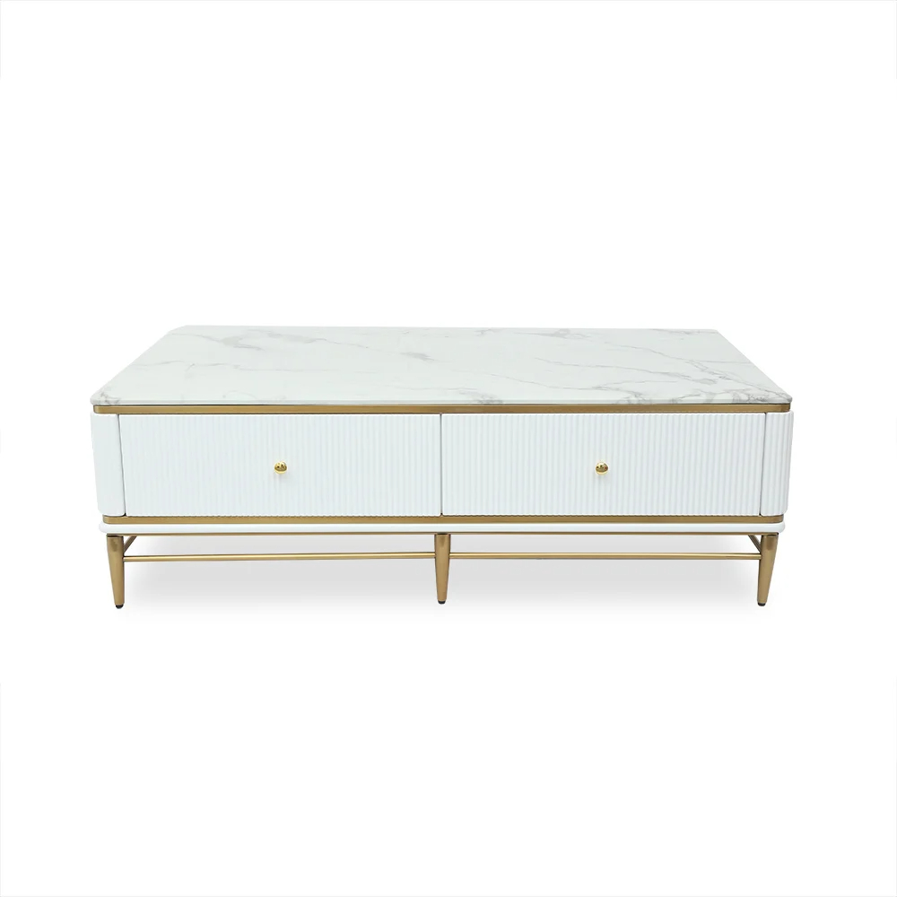 الهيكل مصنوع من خشب متين عالي الجودة يساعد على الحفاظ على ثبات القطع مع الاستخدام المتكرر، كما أن الأدراج الخشبية العازلة للصوت تمنحك تجربة أكثر هدوءًا عند الفتح والإغلاق. أما الأرجل فهي بتصميم معدني متين يمنح الطاولة توازنًا جيدًا ويكمل المظهر الفاخر بطريقة أنيقة دون مبالغة. كما تأتي التفاصيل بلون ذهبي ثابت ينسجم مع اللمسات الراقية في الديكور.