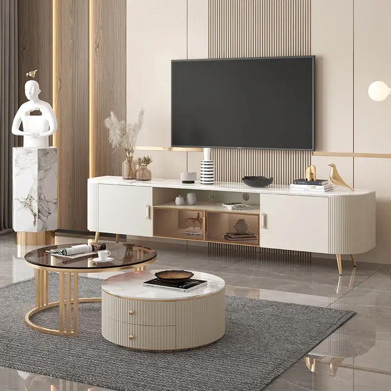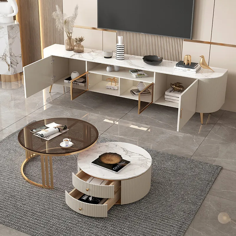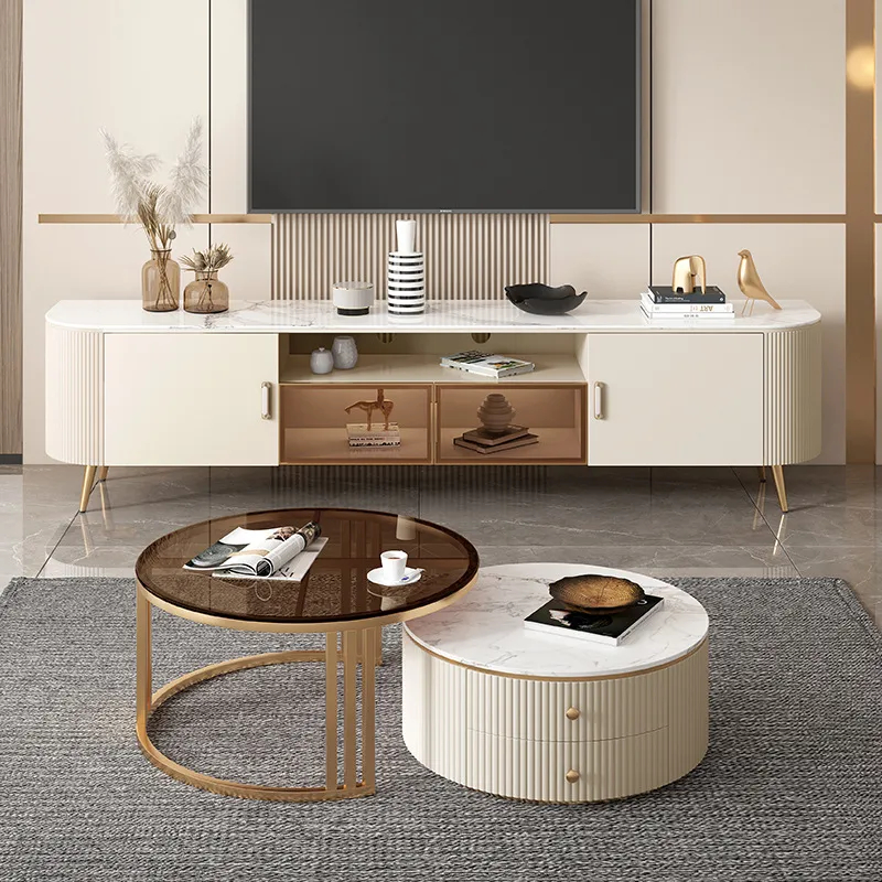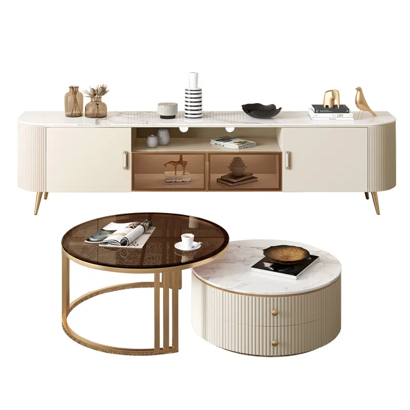 تعد طاولة التلفزيون وطاولتي القهوة هذه إضافة رائعة لأي منزل، حيث تجمع بين الأناقة والوظائف العملية. اجعل من منزلك مكانًا يتألق بأجمل تصاميم الأثاث، واحصل على هذه القطعة الفريدة اليوم.