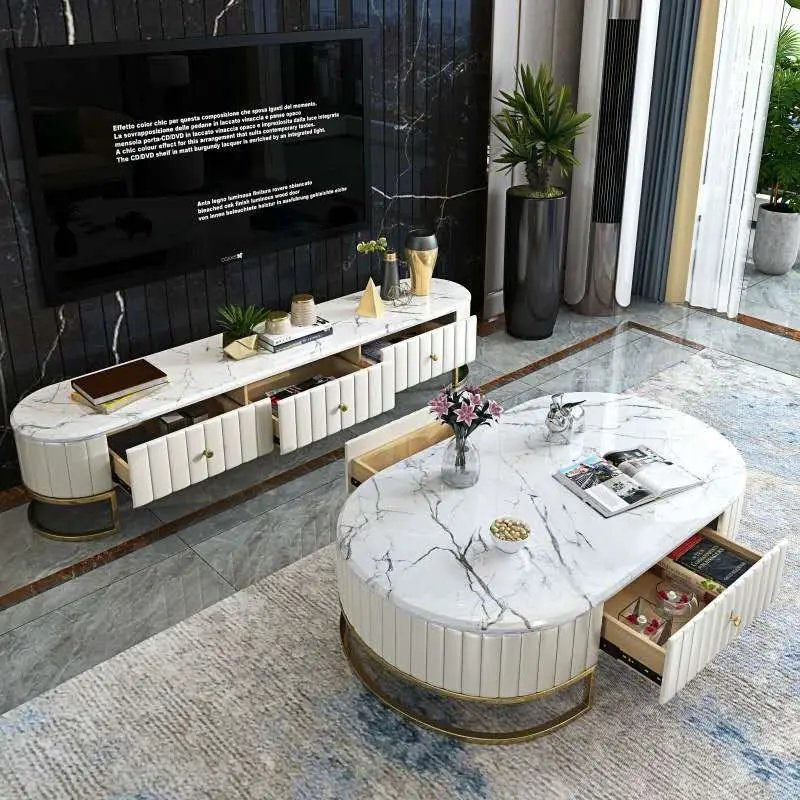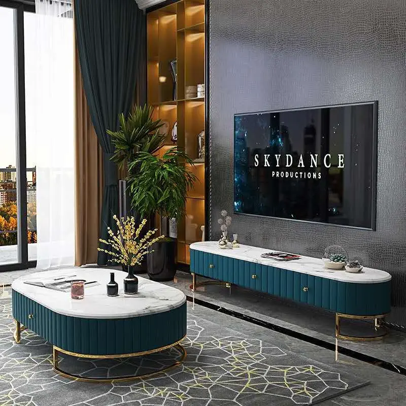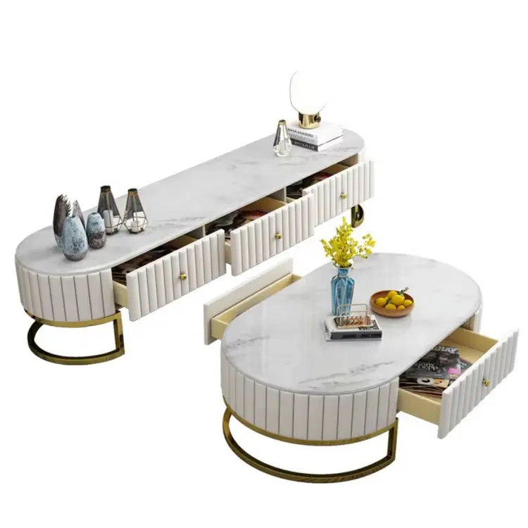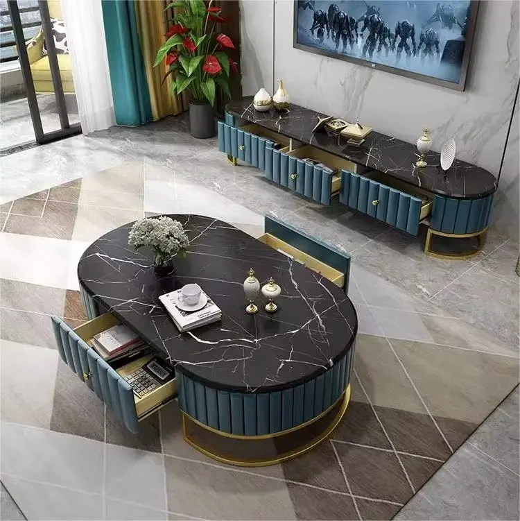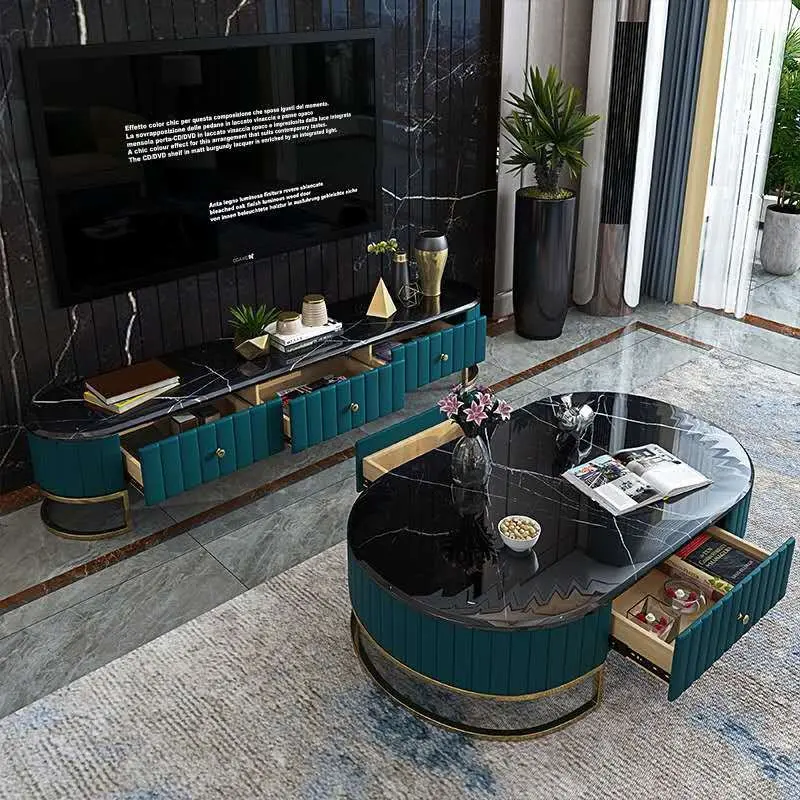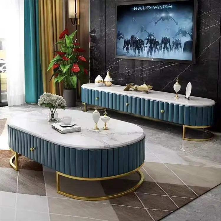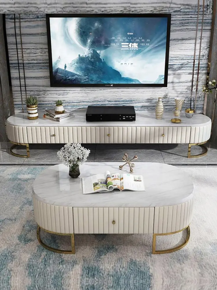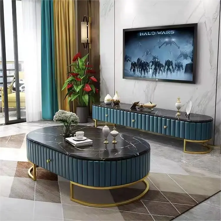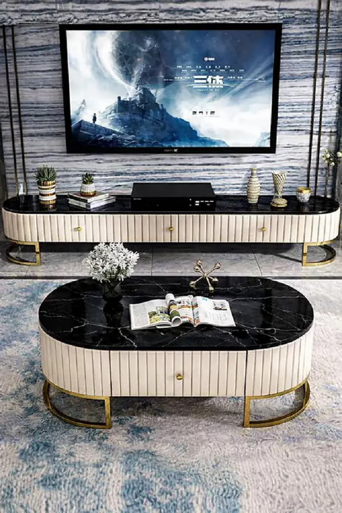 طاولة القهوة عمقها 70 سم، عرضها 130 سم، ارتفاعها 42 سم. وطاولة التلفاز عمقها 48 سم، عرضها 200 سم، ارتفاعها 42 سم.