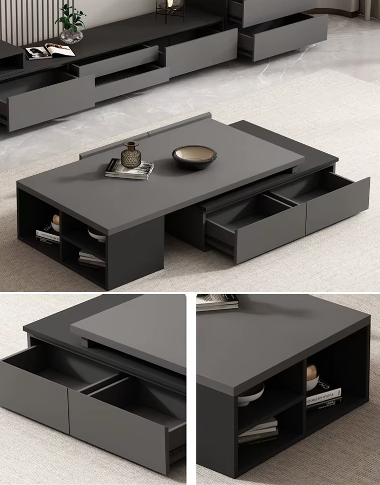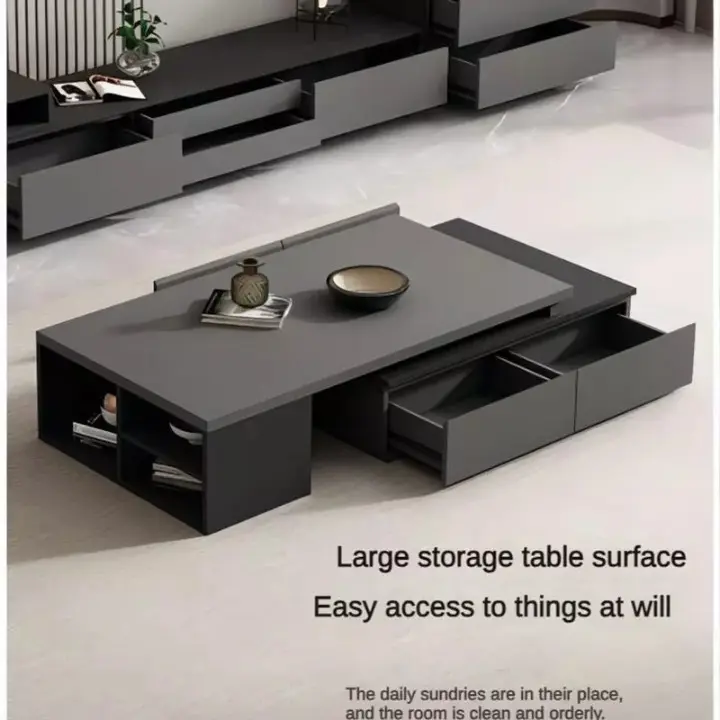تتميز طاولة القهوة بتصميم يسمح بزيادة مساحة السطح عند الحاجة، وهو ما يمنح مرونة في الاستخدام سواء عند تقديم الضيافة أو ترتيب الإكسسوارات المنزلية. هذا التصميم العملي يجعل الطاولة مناسبة للاستخدام مع كنب مريح في الجلسات العائلية.
