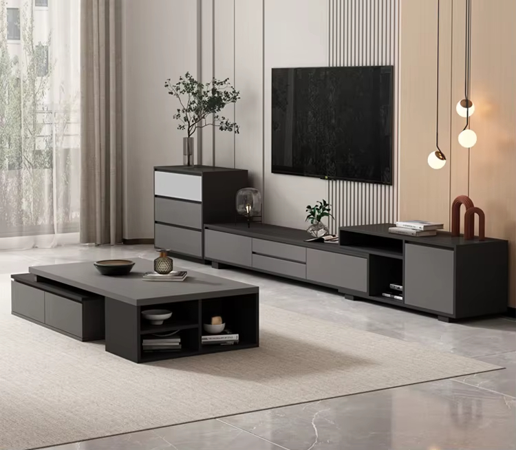 يمكن تنسيق هذا الطقم بسهولة مع كنب حديث أو ضمن كنب صالة معيشة، حيث يوفر مساحة مناسبة لوضع التلفزيون وتنظيم الأجهزة الإلكترونية بالإضافة إلى استخدام طاولة القهوة في الضيافة اليومية.