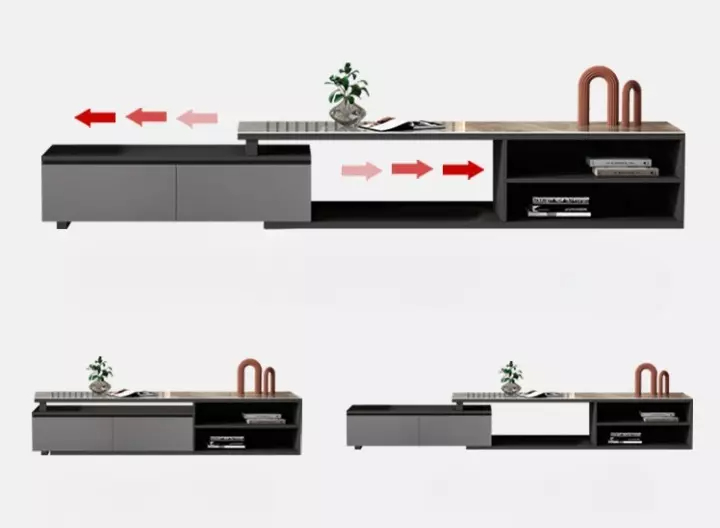 أما وحدة التلفزيون فتأتي بتصميم قابل للتعديل ليتناسب مع مختلف أحجام الشاشات، مما يساعد على تنظيم الأجهزة الإلكترونية والكابلات بطريقة مرتبة داخل غرفة المعيشة.