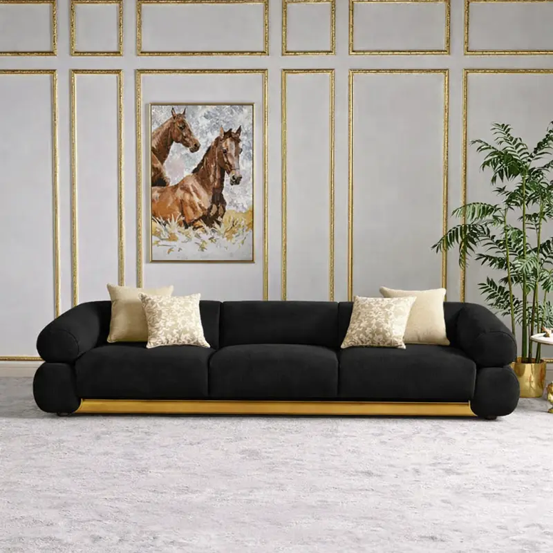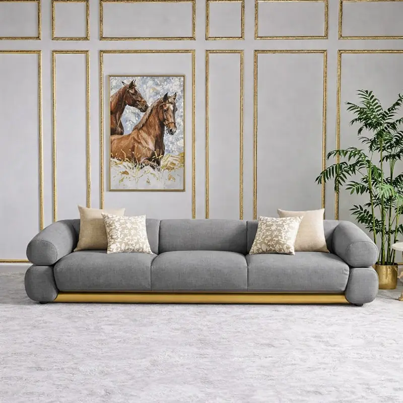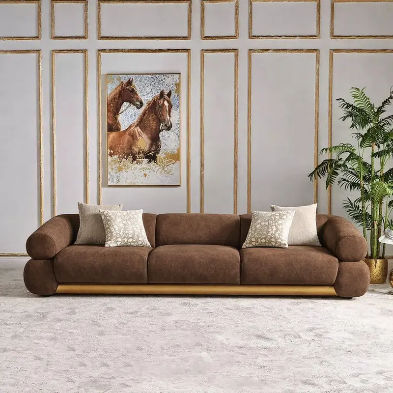 يتميز طقم الكنب المودرن من لوسيندا بخامة عالية الجودة، حيث يأتي الهيكل مصنوعًا من خشب هندسي وخشب زان روماني المعروف بقوته ومتانته. الطقم محشو بإسفنج عالي الجودة، ويغطيه قماش فخم يتميز بالمتانة والراحة، مع قاعدة معدنية قوية مذهبة لإضافة لمسة من الفخامة.