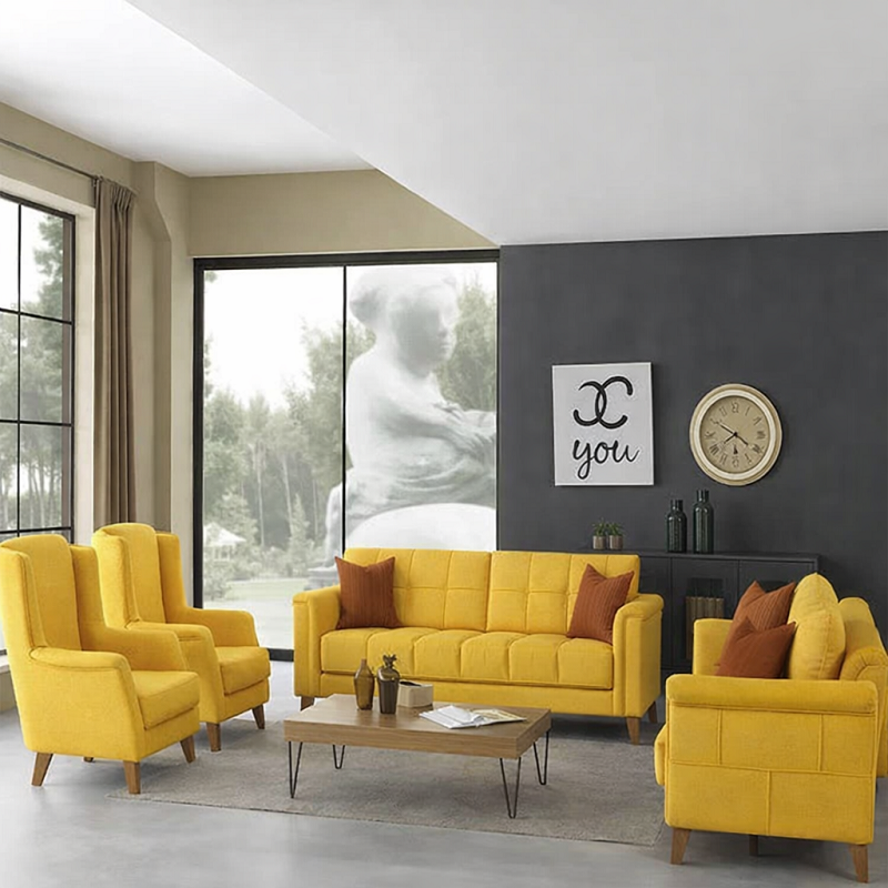 تم تصنيع الهيكل من خشب هندسي فائق الجودة وخشب زان روماني لضمان قوة واستدامة فائقة. يأتي الطقم محشوًا بإسفنج عالي الكثافة والمرونة، مما يوفر لك تجربة جلوس مريحة لفترات طويلة. ولا يقل القماش المستخدم للتغطية، والذي يأتي بتصميم متعدد الألوان، عن جودة عالية لتعزيز مظهر الطقم ومتانته.