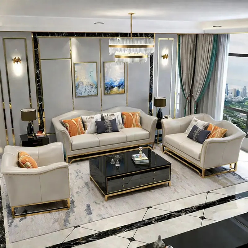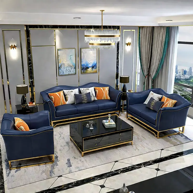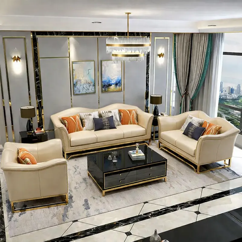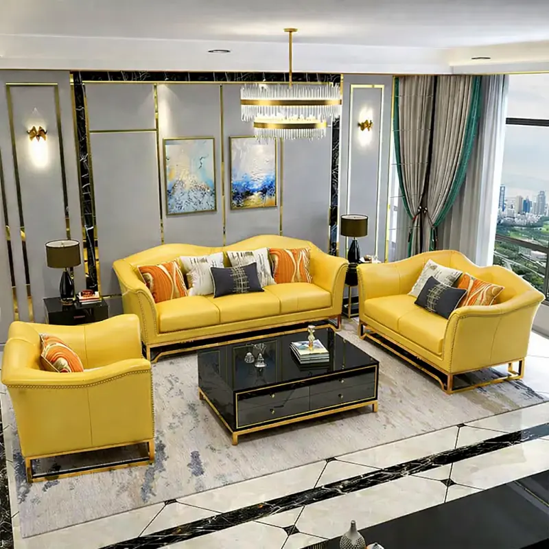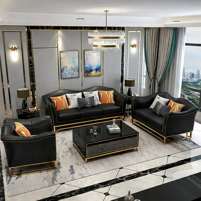 الكسوة من الجلد الأصلي عالي الجودة، لذلك تبدو القطع مرتبة وسهلة التنسيق مع أنماط متعددة من الأثاث الداخلي. أما الأرجل فهي بتصميم معدني قوي يمنح القاعدة ثباتًا إضافيًا ويتناسب مع الطابع العصري العام للطقم.