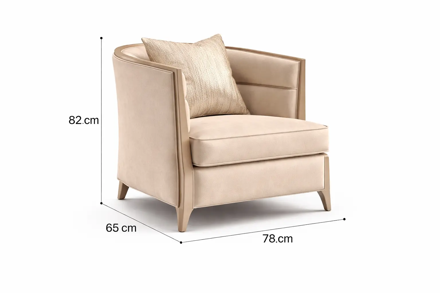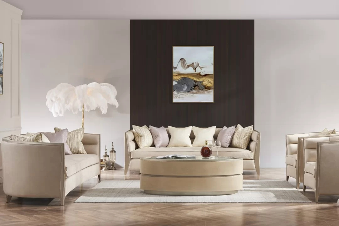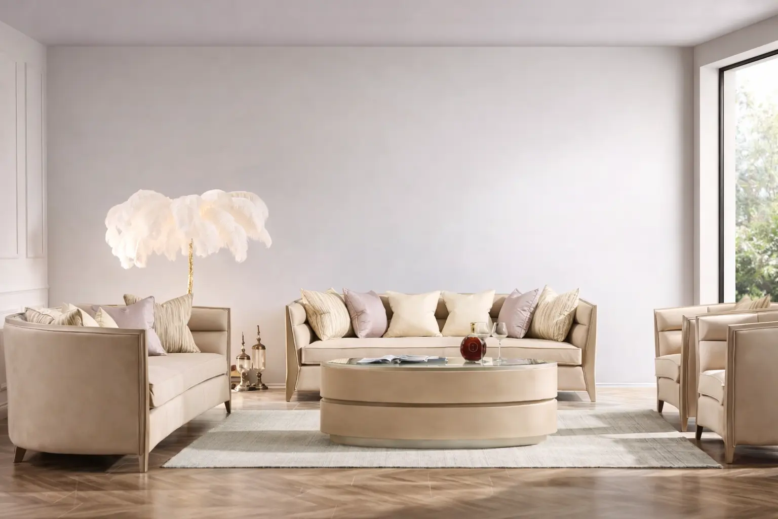 يتكون الطقم من كنبة ثلاثية مع كراسي مفردة، ما يوفر توزيعًا عمليًا داخل المساحة سواء كانت غرفة معيشة واسعة أو متوسطة. هذا التكوين يمنح مرونة في ترتيب الجلسة بطريقة تناسب الاستخدام اليومي أو استقبال الضيوف.