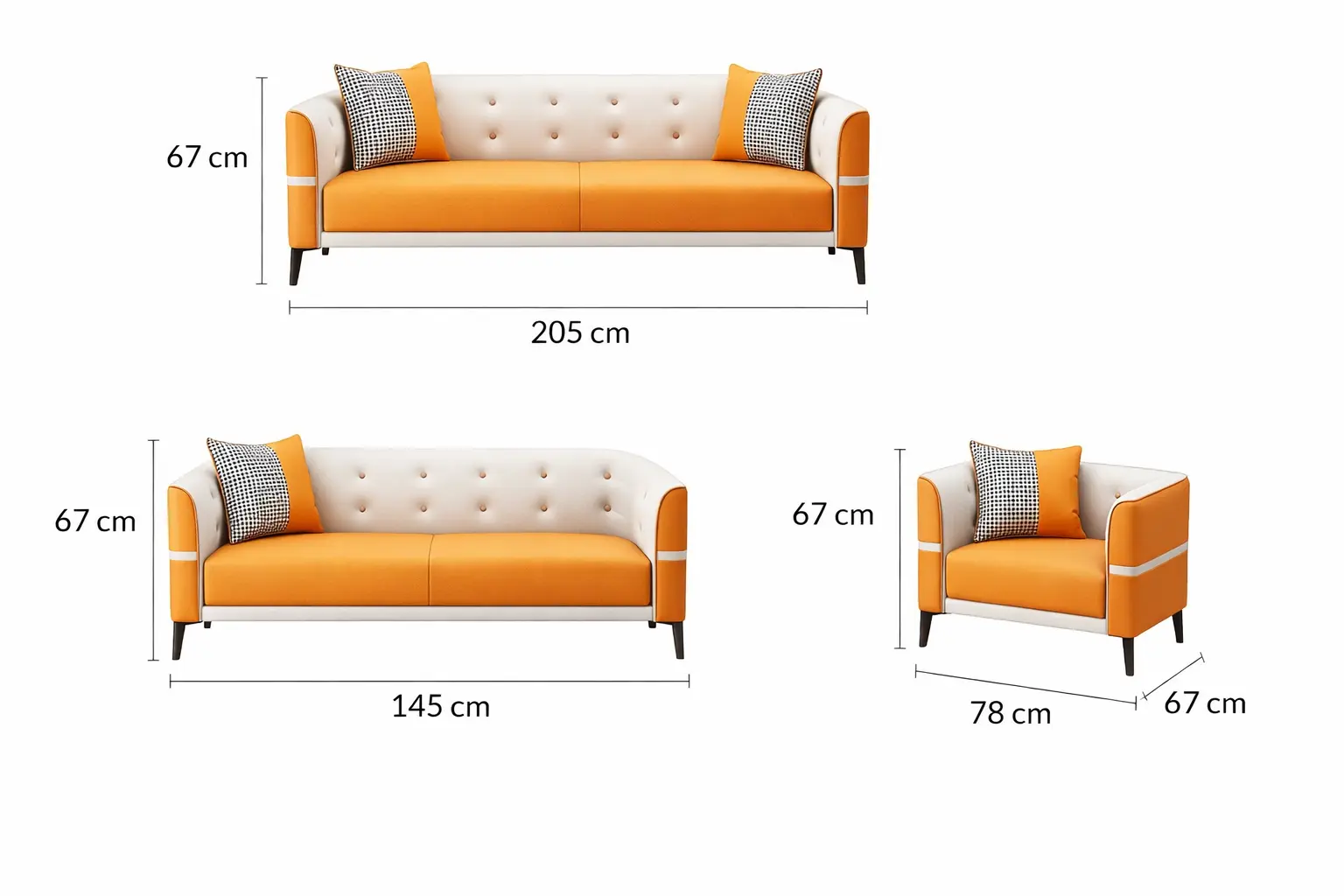 الكنبة الثلاثية ارتفاعها 67 سم وعرضها 205 سم، والثنائية ارتفاعها 67 سم وعرضها 145 سم، والمفردة ارتفاعها 67 سم وعرضها 78 سم.
