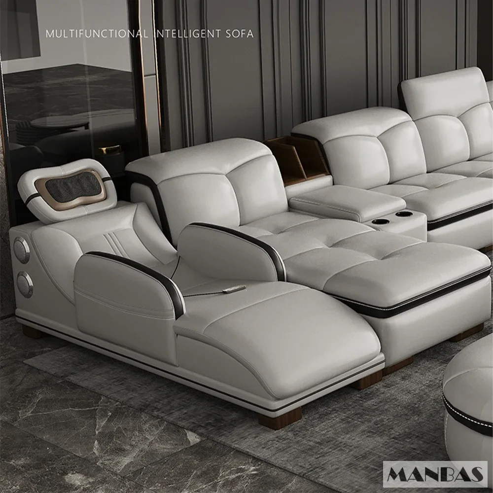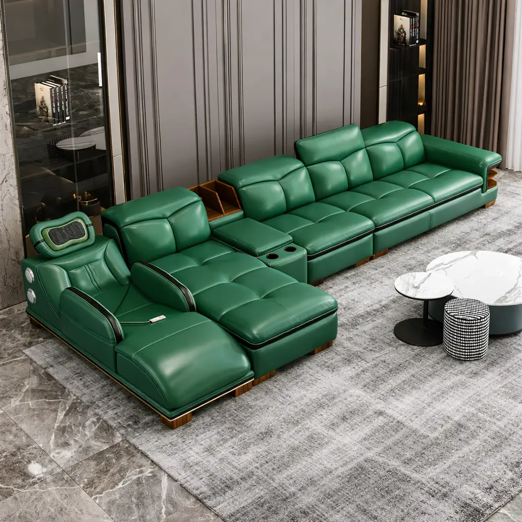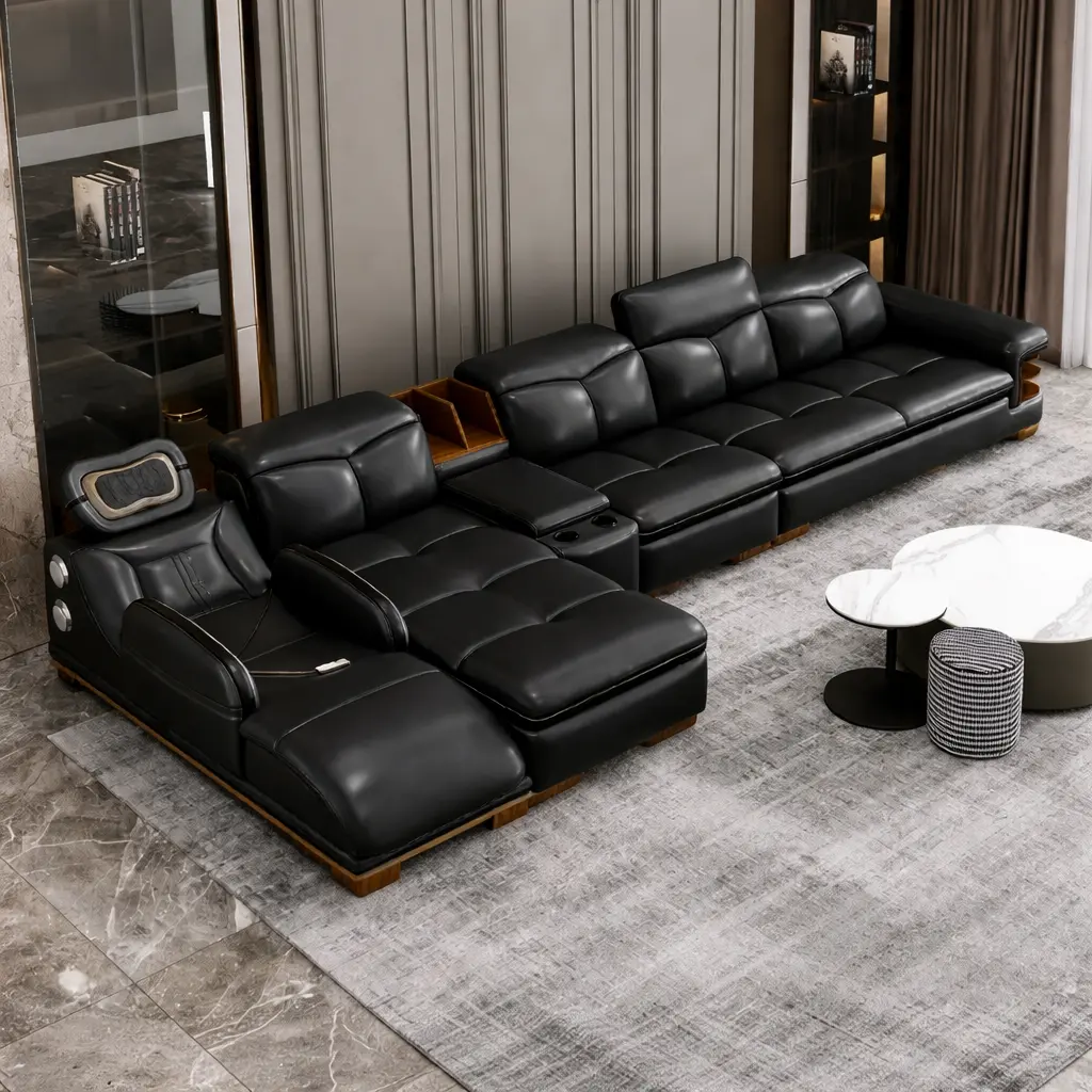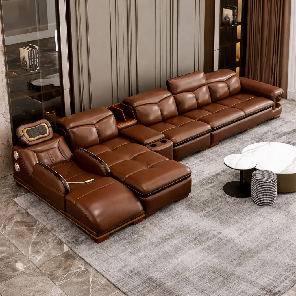 المقاعد مبطنة بإسفنج عالي الكثافة يوفر دعمًا مريحًا للجسم، بينما يغطي الكنب جلد عالي الجودة يمنح ملمسًا ناعمًا ومظهرًا أنيقًا داخل غرفة المعيشة. هذا ما يجعله مناسبًا لمن يبحث عن كنب مريح للاسترخاء أو الجلوس لفترات طويلة.