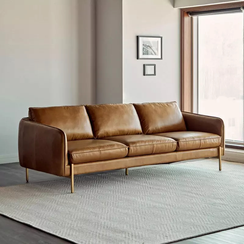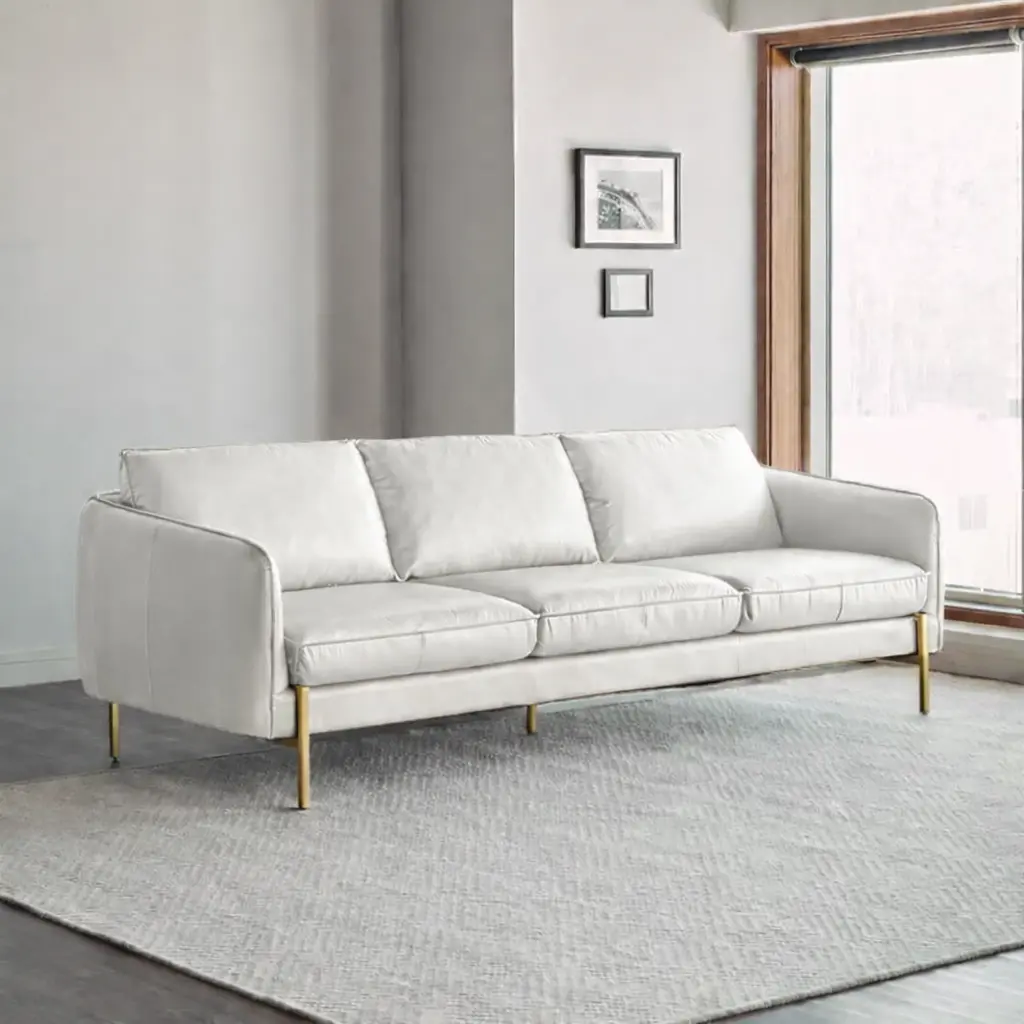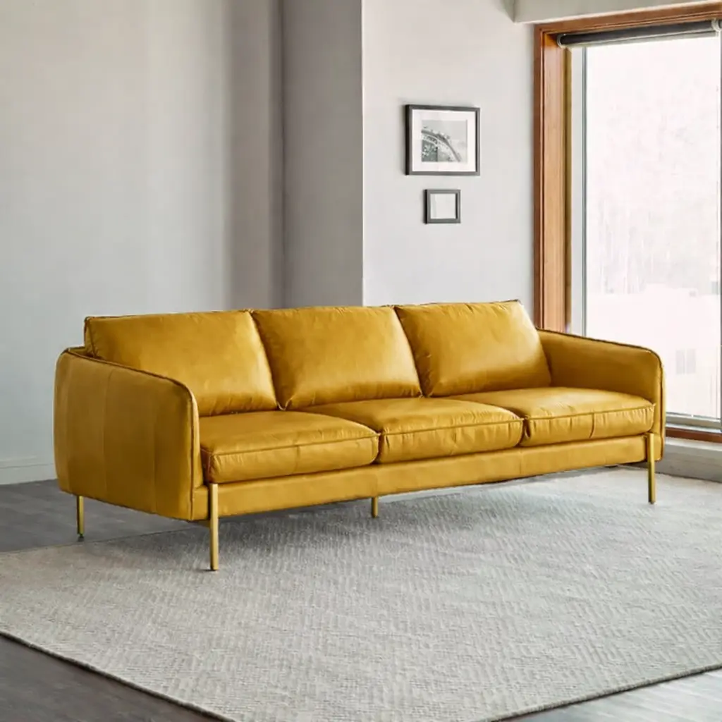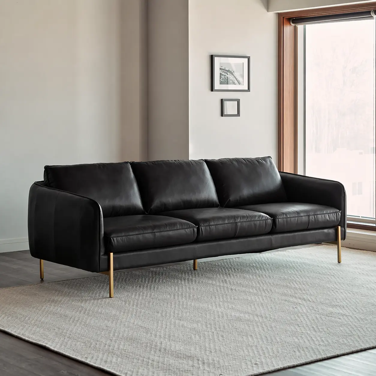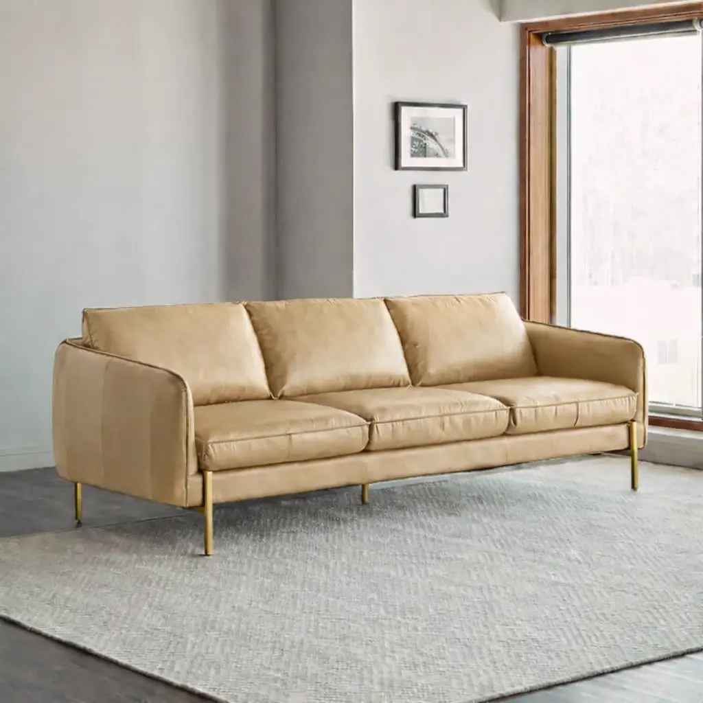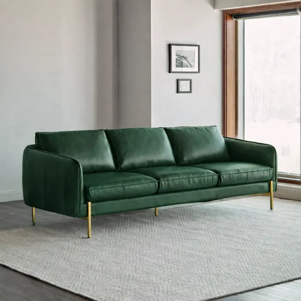 كنب مودرن بتصميم جورديان مكون من ثلاث مقاعد، مثالي للصالة، يجمع بين الأناقة والراحة. مصنوع من خشب هندسي متين وأرجل معدنية قوية، مع مقاعد مغطاة بجلد عالي الجودة. يأتي بمجموعة متنوعة من الألوان ليتناسب مع ديكور منزلك.ضمان لمدة سنتين ضد عيوب التصنيع لضمان تجربة شراء خالية من المخاوف