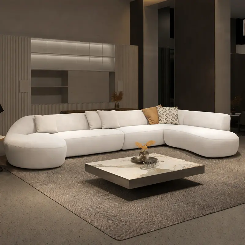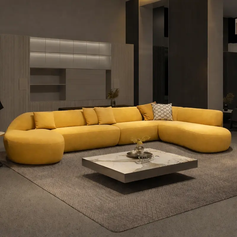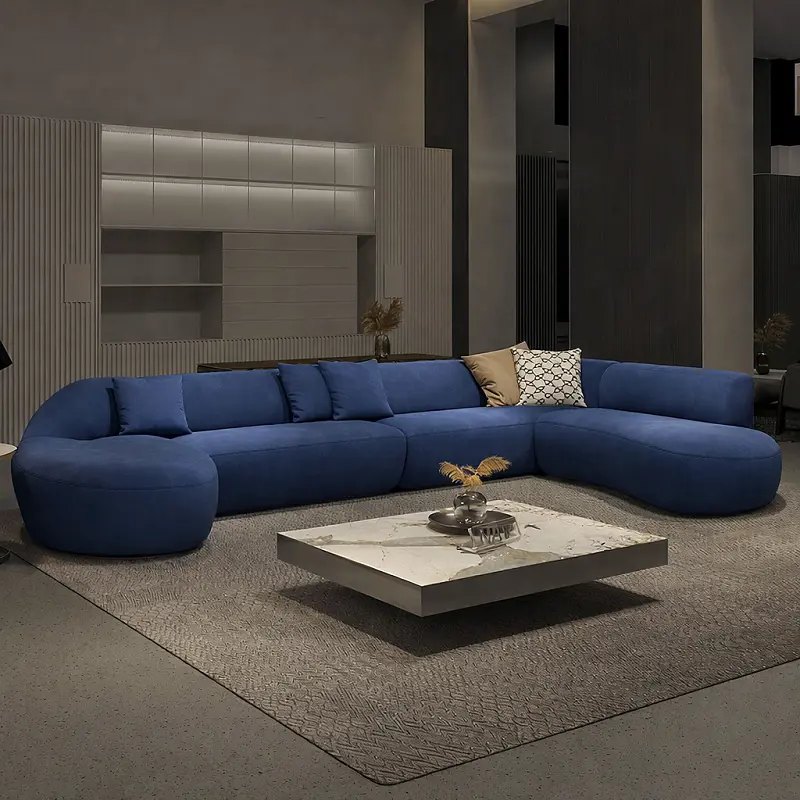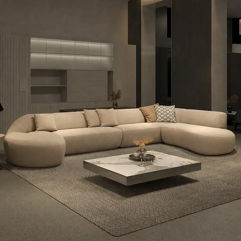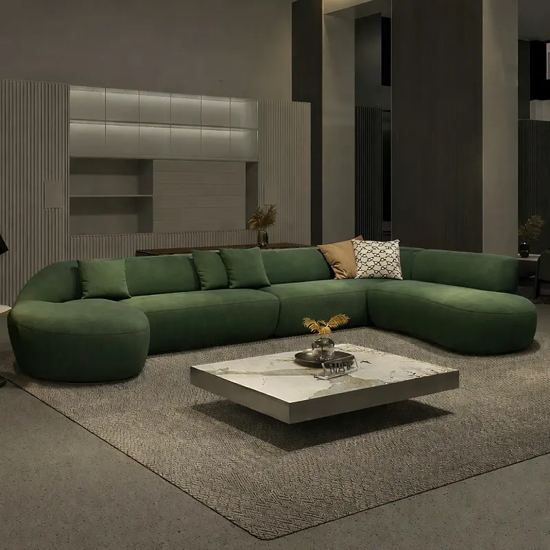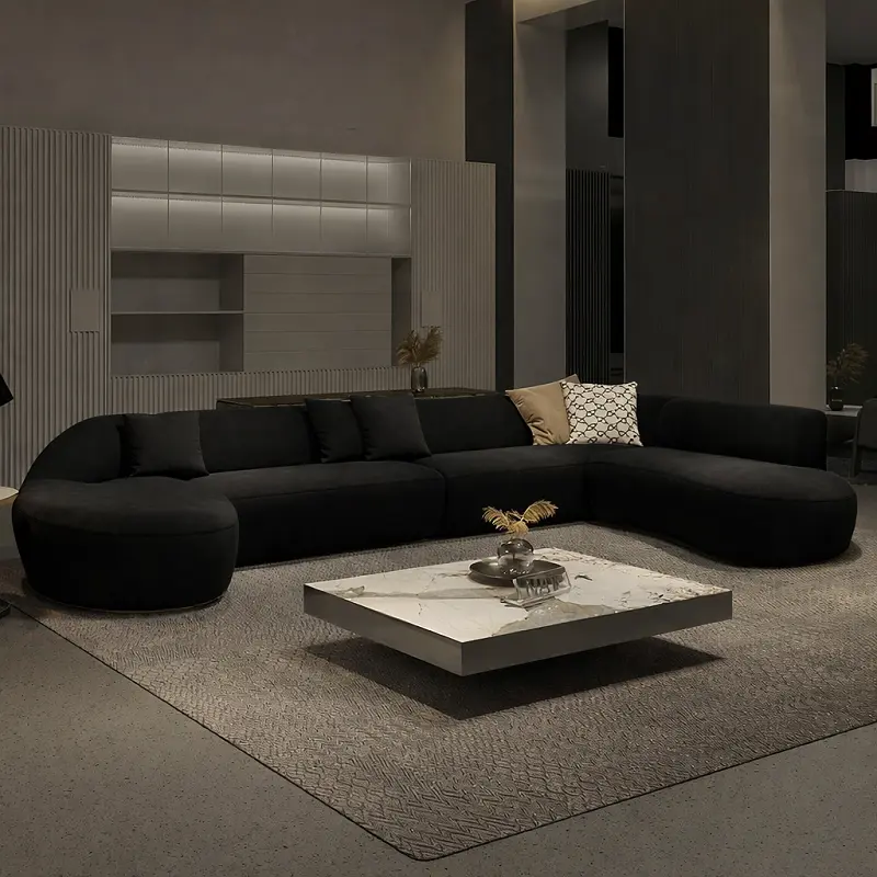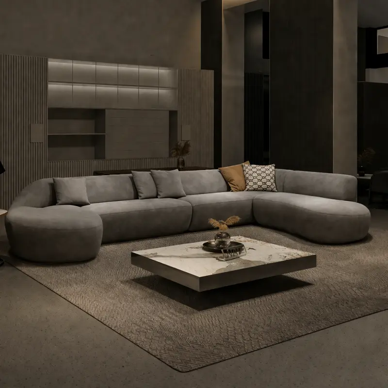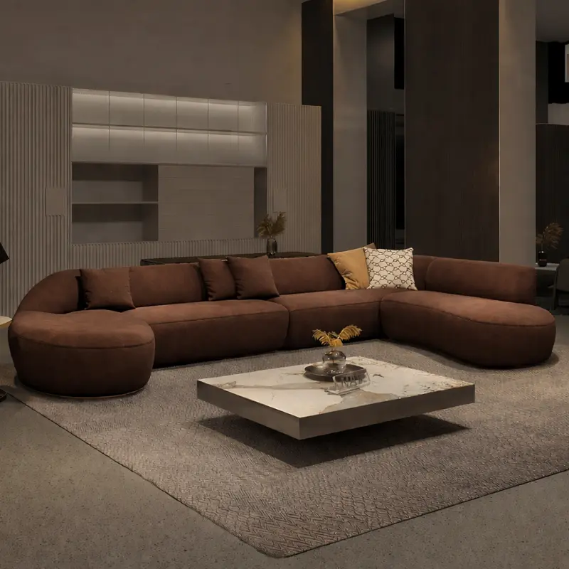 الميزة الأهم في هذا التصميم أنه لا يركز على الشكل فقط، بل يقدم تجربة جلوس مناسبة للحياة اليومية داخل المنزل. سواء كان الاستخدام أثناء الجلسات العائلية أو استقبال الضيوف أو أوقات الراحة المعتادة، فإن هذا الكنب المريح يمنح إحساسًا جيدًا بالاستقرار والدعم. كما أن تصميمه المنحني يخفف من حدة الزوايا داخل المكان ويمنح الصالة مظهرًا أكثر توازنًا، لذلك يعد خيارًا مناسبًا لمن يرغب في كنب حديث ينسجم مع المساحات الواسعة وشبه المفتوحة.