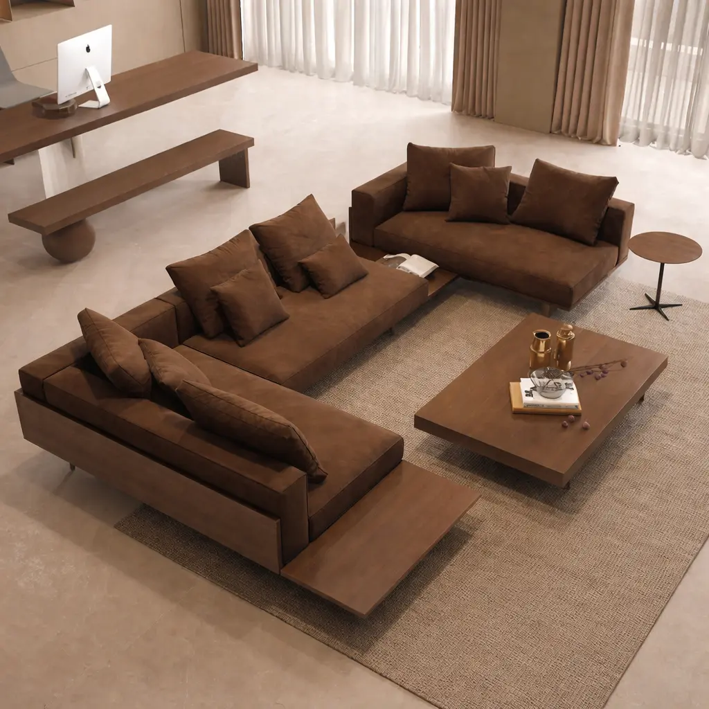 الكنب مصنوعة من خشب هندي متين مع قماش ناعم ومريح، مبطن بإسفنج عالي الكثافة، فهذي الخامة تعطيك راحة وديمومة.
