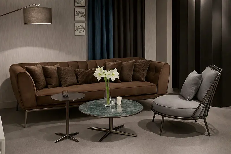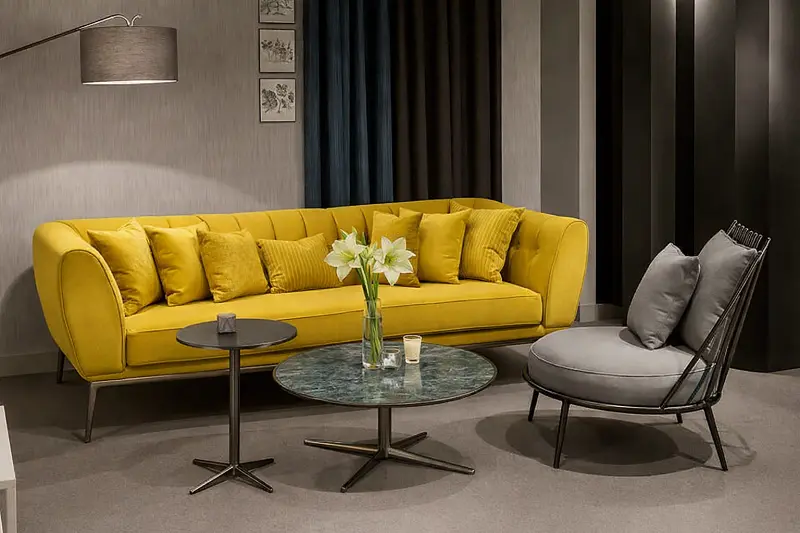 تم تصنيع كنبة مودرن باستخدام مواد عالية الجودة تضمن متانتها وراحتها الفائقة. وهي مصنوعة من الخشب الهندسي المتين ومغطاة بطبقة من القماش المخملي الرائع والمريح المبطن بالاسفنج عالي الكثافة. كما أنها مزودة بقاعدة من المعدن الصلب المقاوم للصدأ مما يعزز من قوتها واستقرارها. هذه الكنبة تعتبر مثالية للاستخدام في الصالة حيث تجمع بين الأناقة والراحة، مما يجعلها خيارًا ممتازًا لجلسات الاسترخاء العائلية.