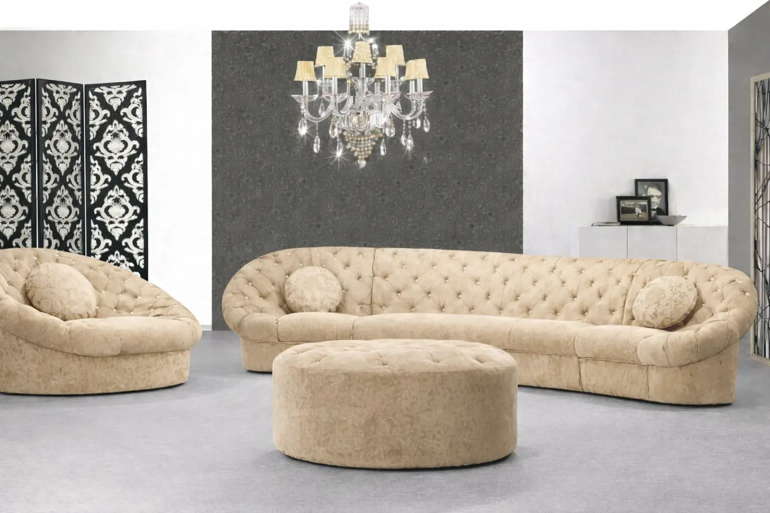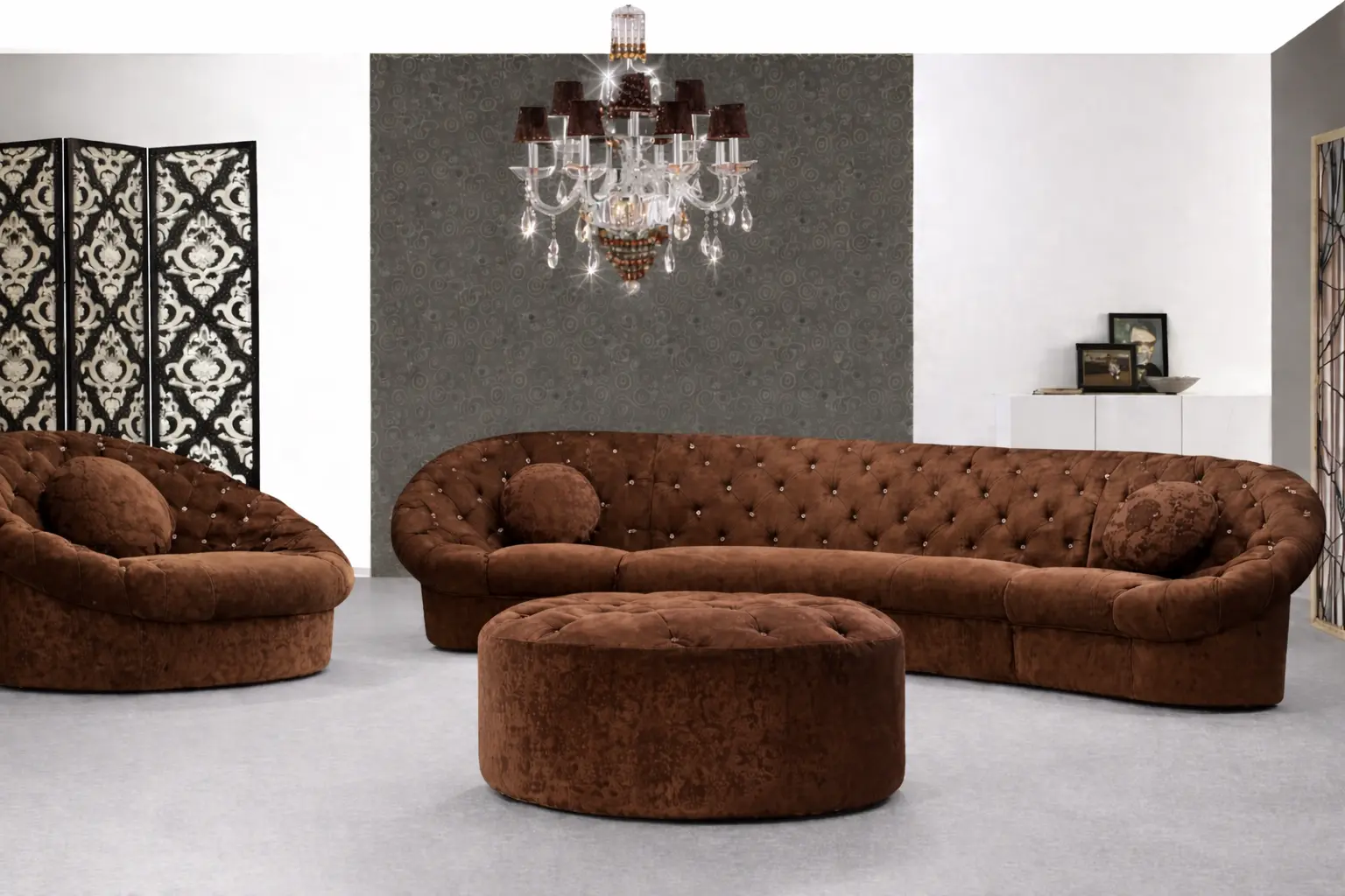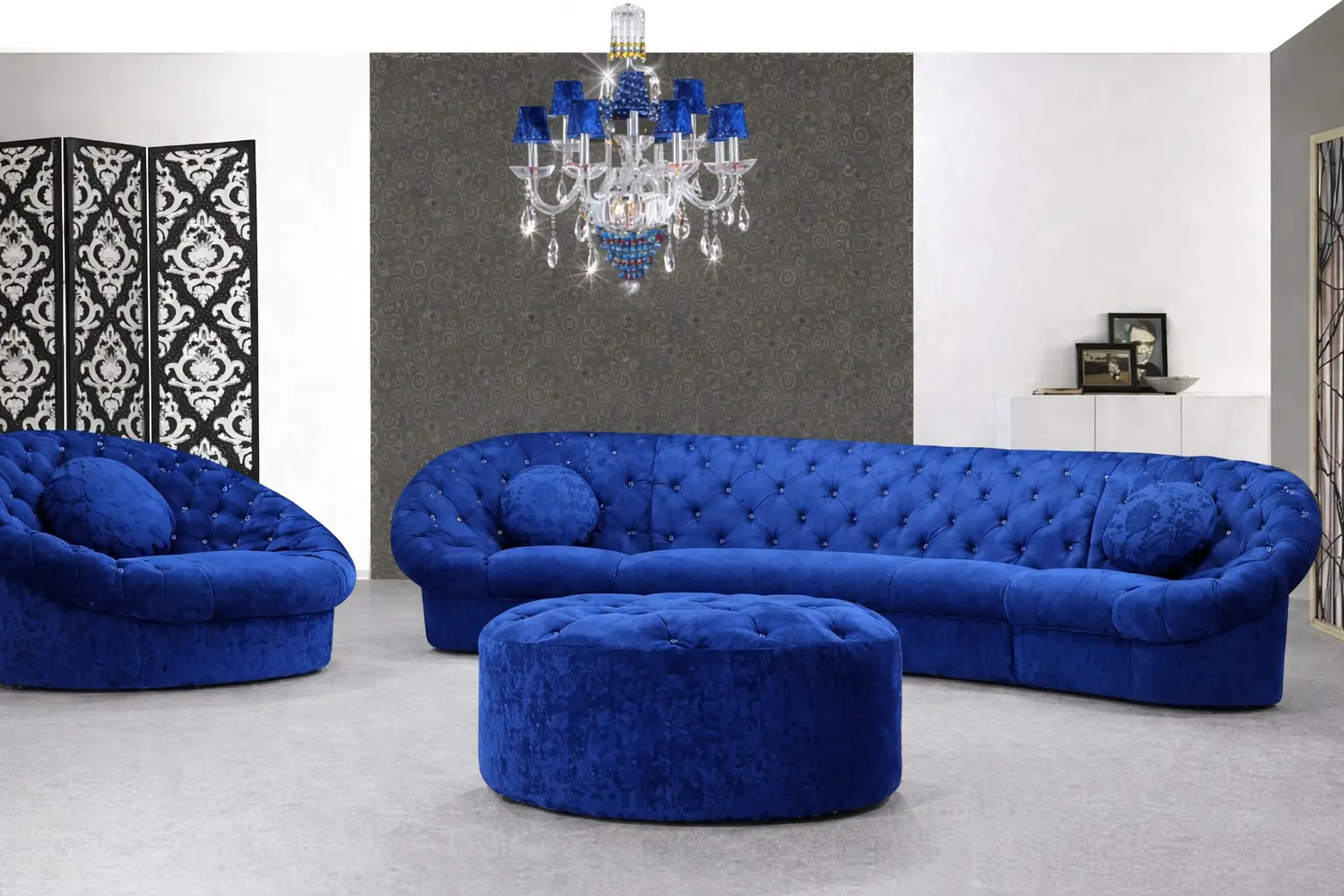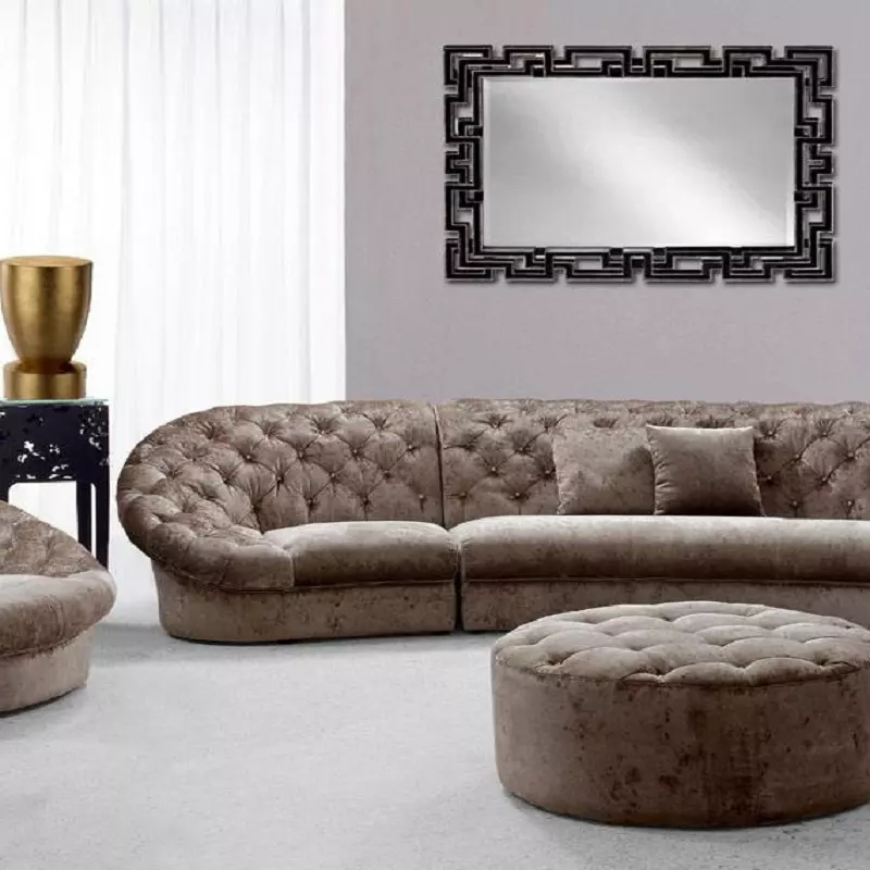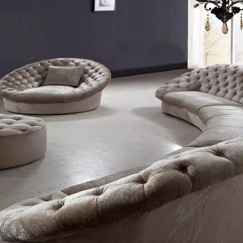 وجود كرسي مفرد دائري بتفصيل كابوتونيه يضيف بعدًا مختلفًا للمجلس أو الصالة، حيث يمكن استخدامه كقطعة مستقلة أو ضمن التكوين العام للجلسة. هذا النوع من التصميم يمنح مرونة أكبر في ترتيب الأثاث، خصوصًا في المساحات التي تحتاج إلى تنويع في توزيع الجلسات.