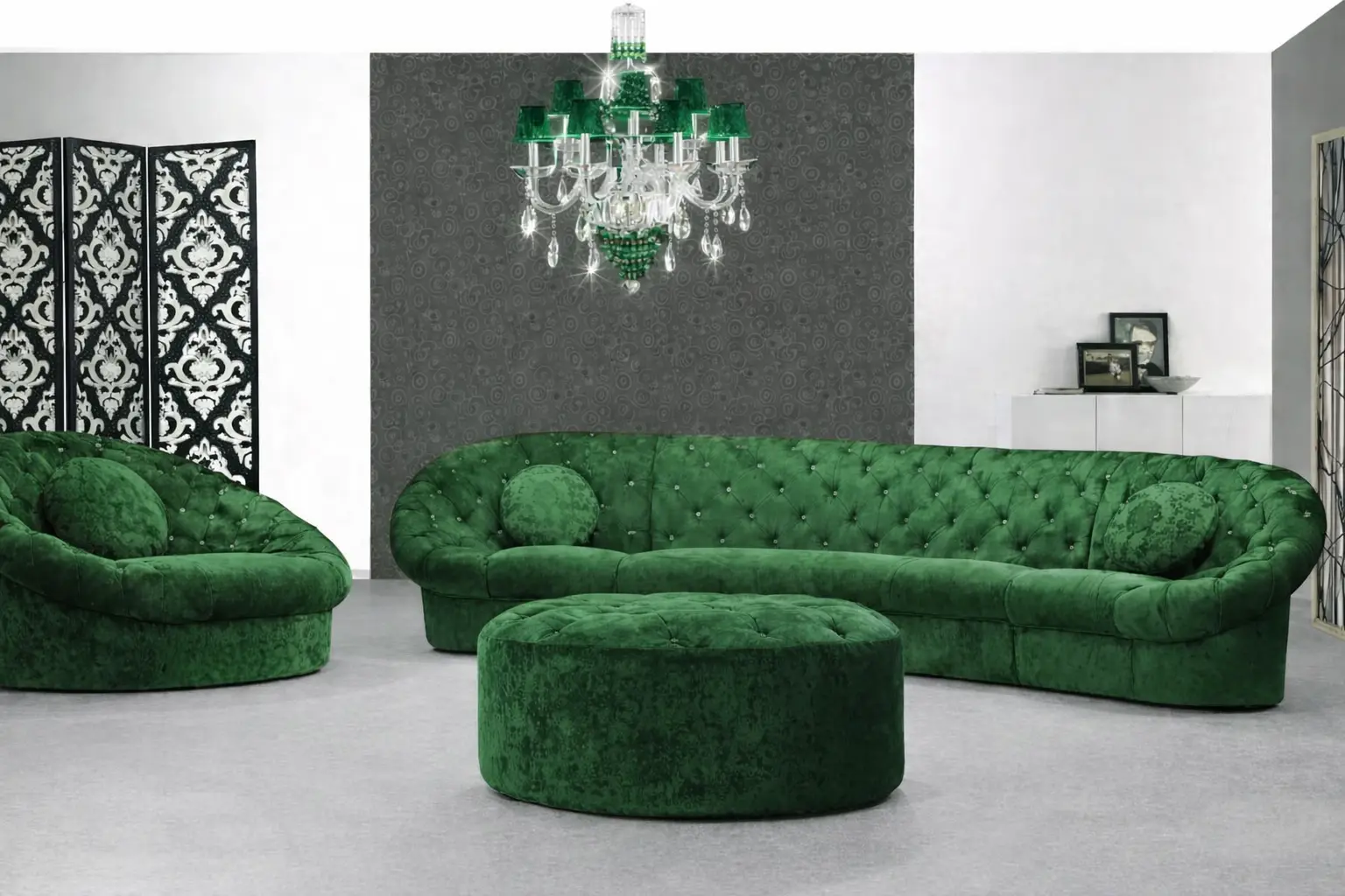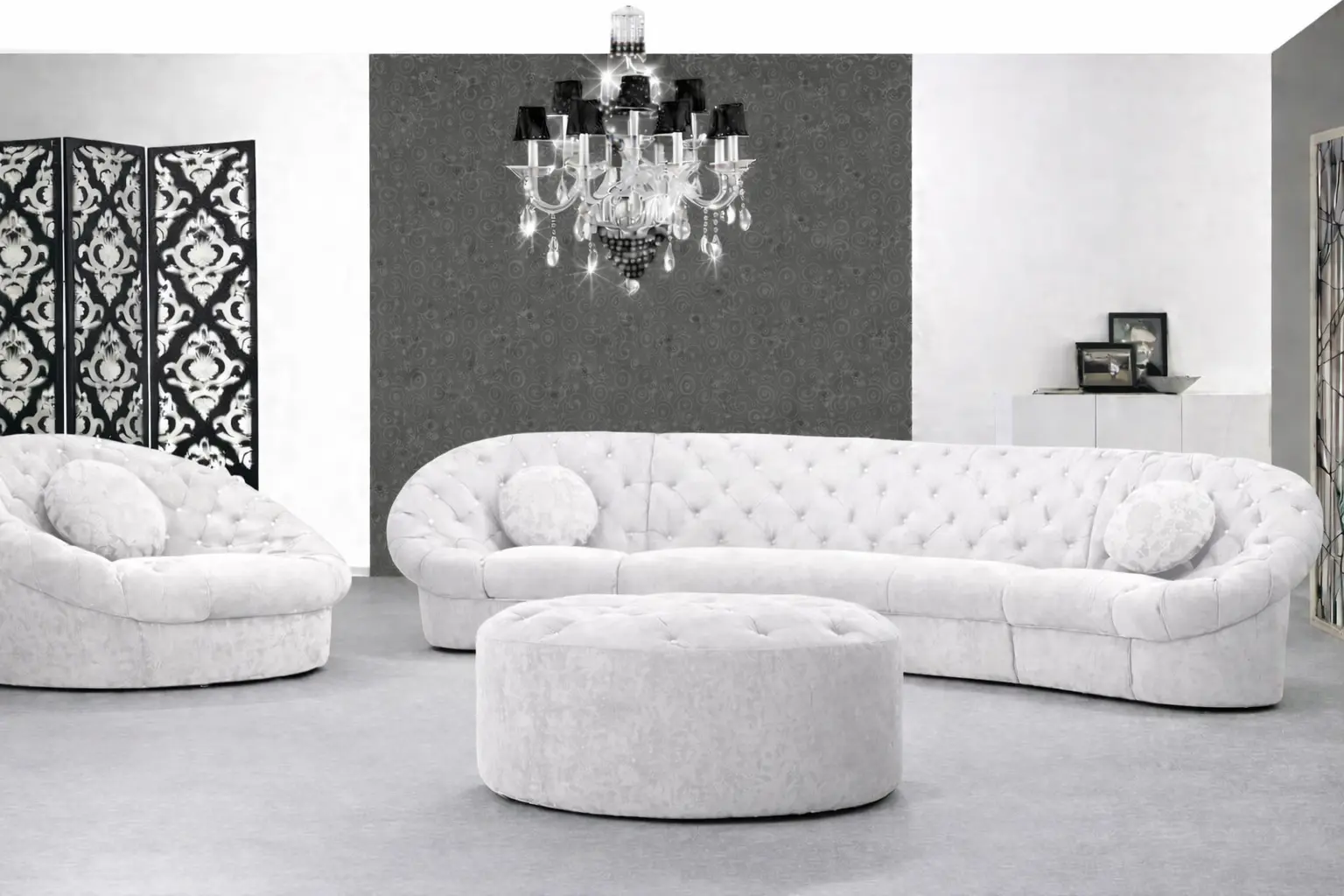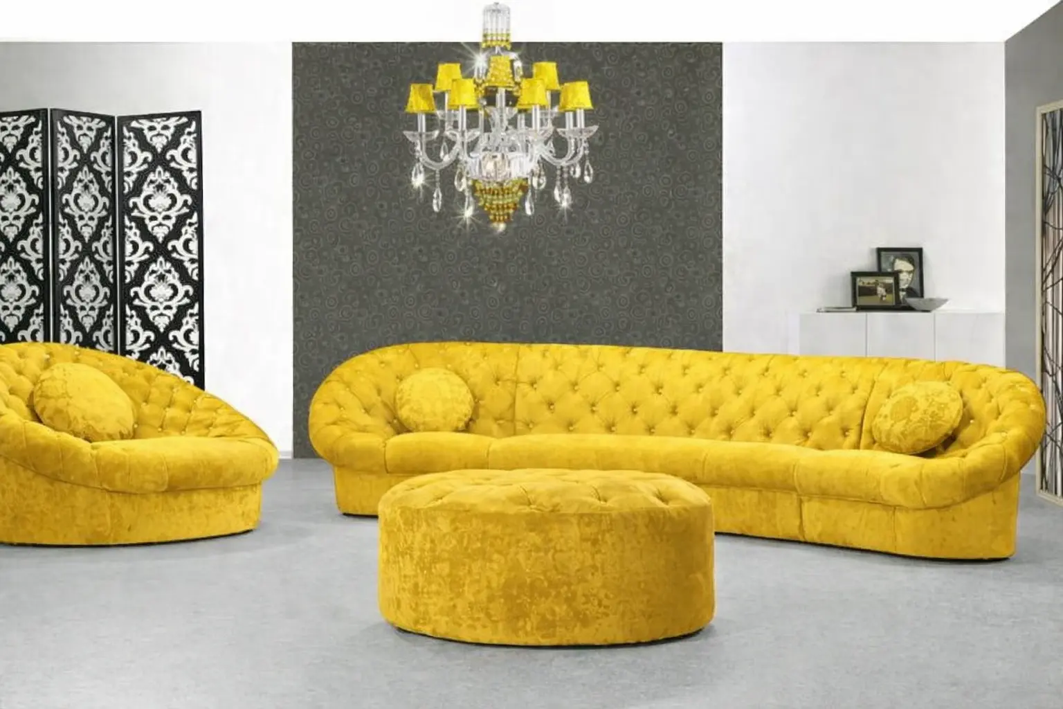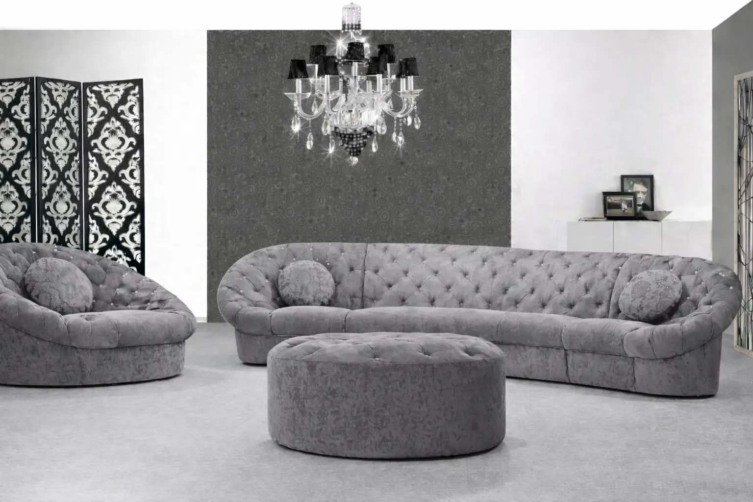 وجود كرسي مفرد دائري بتفصيل كابوتونيه يضيف بعدًا مختلفًا للمجلس أو الصالة، حيث يمكن استخدامه كقطعة مستقلة أو ضمن التكوين العام للجلسة. هذا النوع من التصميم يمنح مرونة أكبر في ترتيب الأثاث، خصوصًا في المساحات التي تحتاج إلى تنويع في توزيع الجلسات.