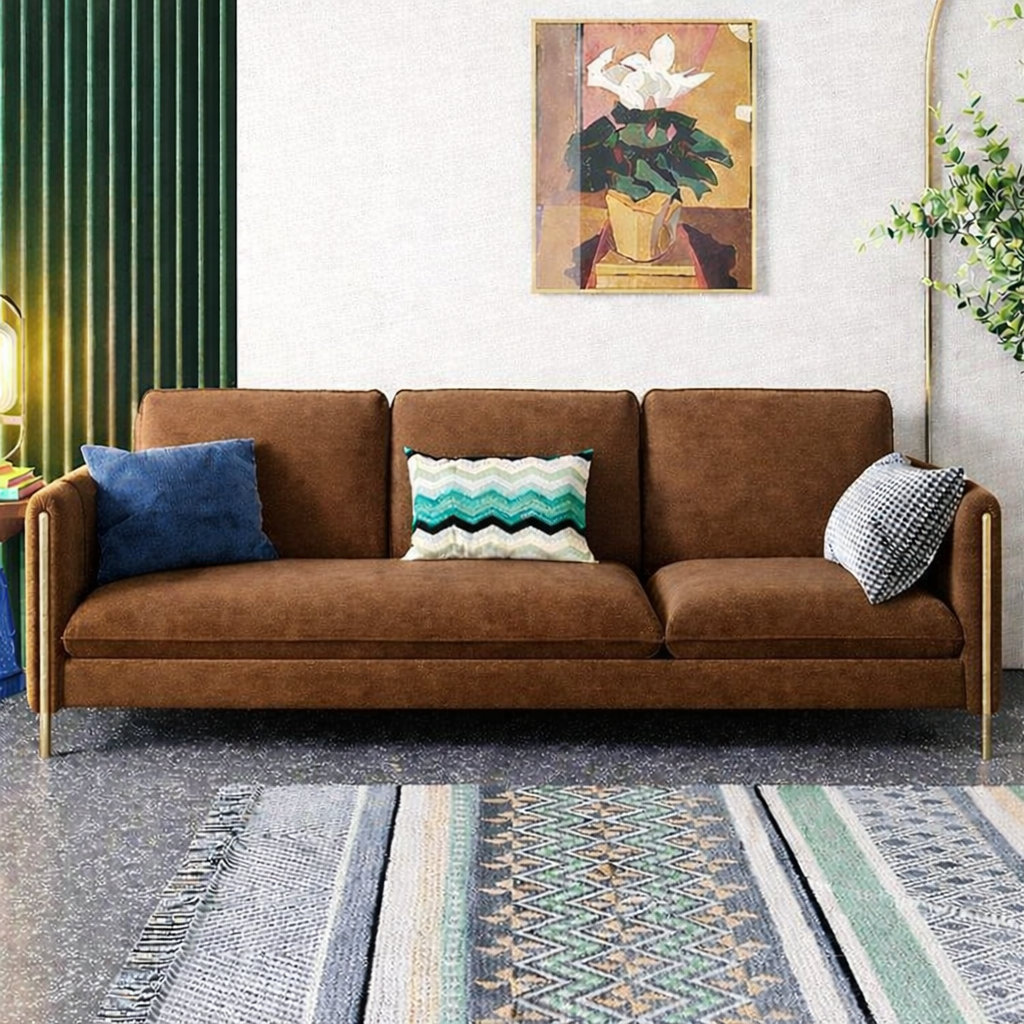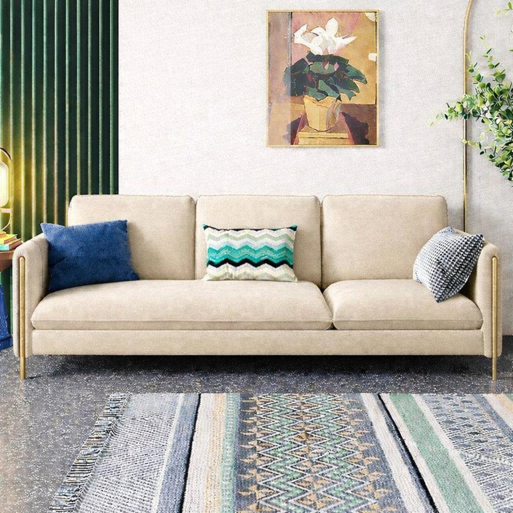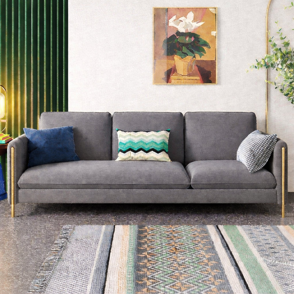 المقاعد مبطنة بإسفنج عالي الكثافة يوفر دعمًا مريحًا للجسم أثناء الجلوس، بينما يغطي الكنب قماش مخملي عالي الجودة يمنح ملمسًا ناعمًا ومظهرًا أنيقًا. كما يحتوي التصميم على أرجل وهيكل معدني يعزز استقرار الكنب ويمنحه حضورًا عصريًا يتماشى مع الأثاث الحديث.