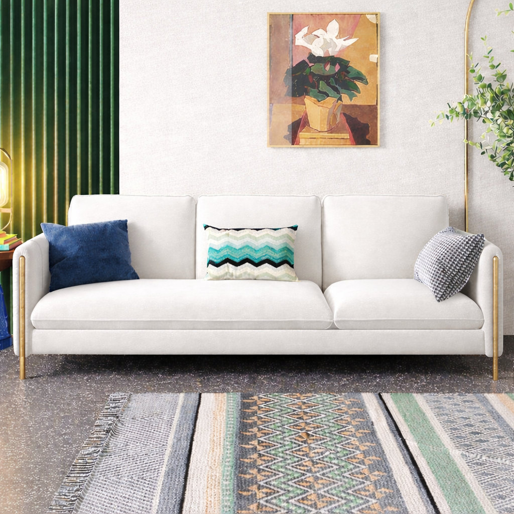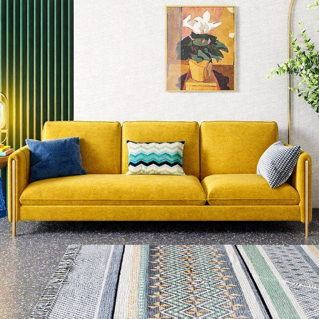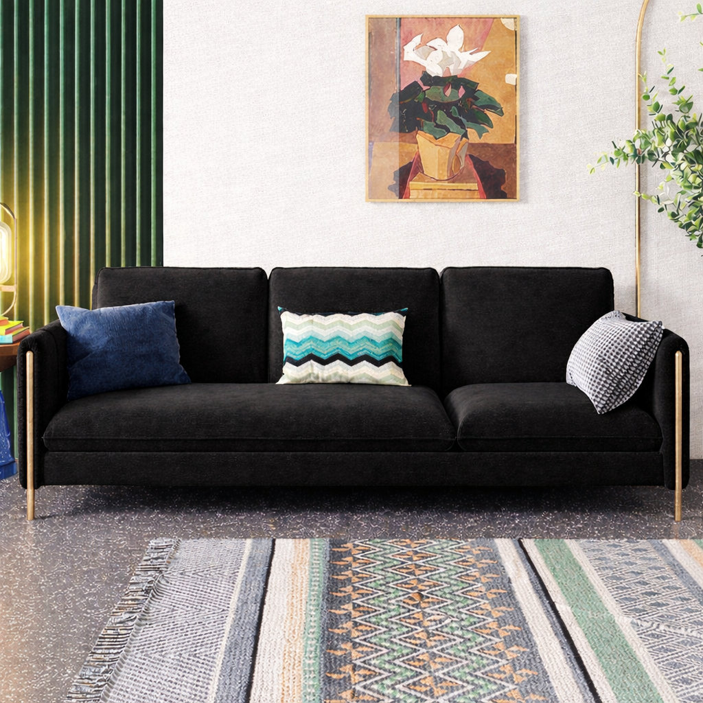 المقاعد مبطنة بإسفنج عالي الكثافة يوفر دعمًا مريحًا للجسم أثناء الجلوس، بينما يغطي الكنب قماش مخملي عالي الجودة يمنح ملمسًا ناعمًا ومظهرًا أنيقًا. كما يحتوي التصميم على أرجل وهيكل معدني يعزز استقرار الكنب ويمنحه حضورًا عصريًا يتماشى مع الأثاث الحديث.