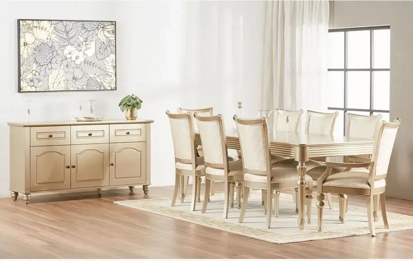 يمتاز هذا البوفيه بأسلوب حديث يجعله مناسبًا للدمج مع طاولة طعام مع كراسي أو بجانب طاولة طعام خشب داخل غرفة الطعام. وجوده بجوار الطاولة يسهل ترتيب أدوات التقديم والأطباق ويجعل استخدامها أكثر سهولة أثناء الوجبات العائلية.