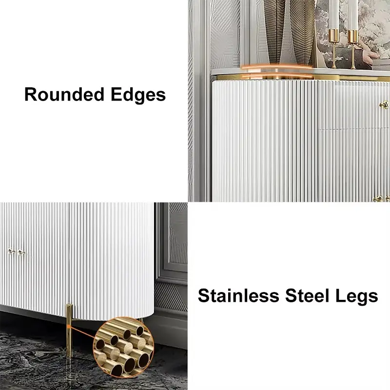 تم تصنيعه من معدن قوي وعالي الجودة، بسطح رخام مميز مقاوم للخدش وسهل التنظيف، ومزود بأرفف وأدراج من خشب هندسي وخشب زان روماني عالي الجودة، مع مساحات جيدة وواسعة للتخزين، وأرجل من الستانليس ستيل المقاوم للصدأ بلون ذهبي مميز.