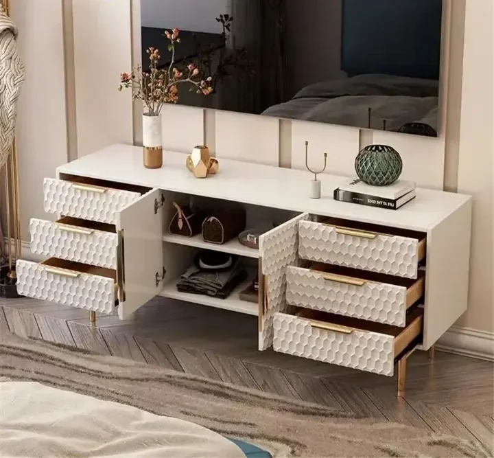 تتألق طاولة بوفيه بتدرجات اللون الأبيض والذهبي، مما يضفي لمسة من التألق والفخامة إلى منزلك. يتيح هذا الاختيار اللوني إمكانية تناغم القطعة مع مختلف أنماط الديكور.