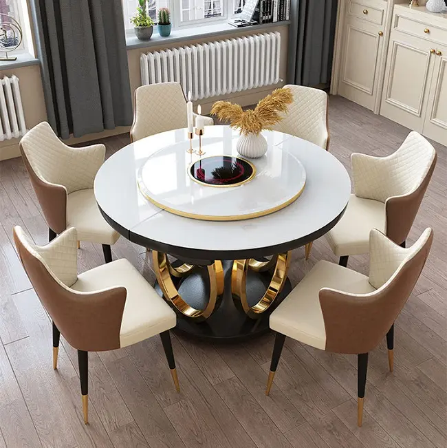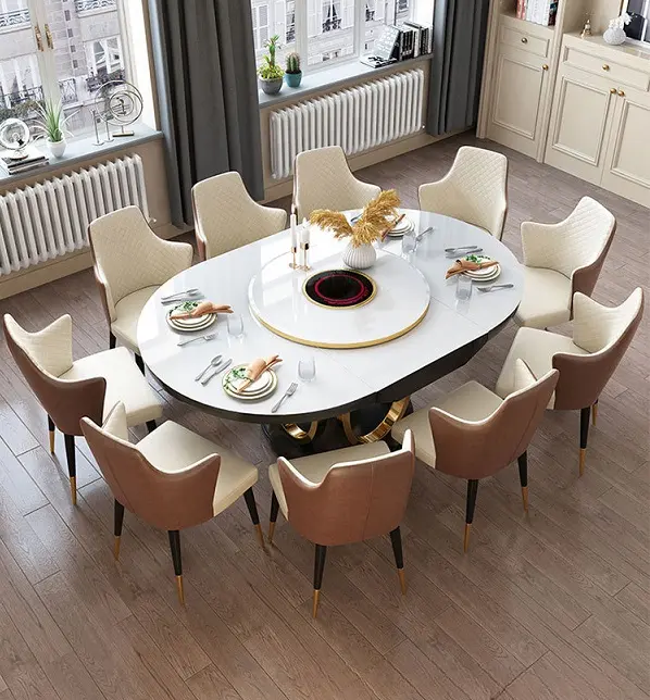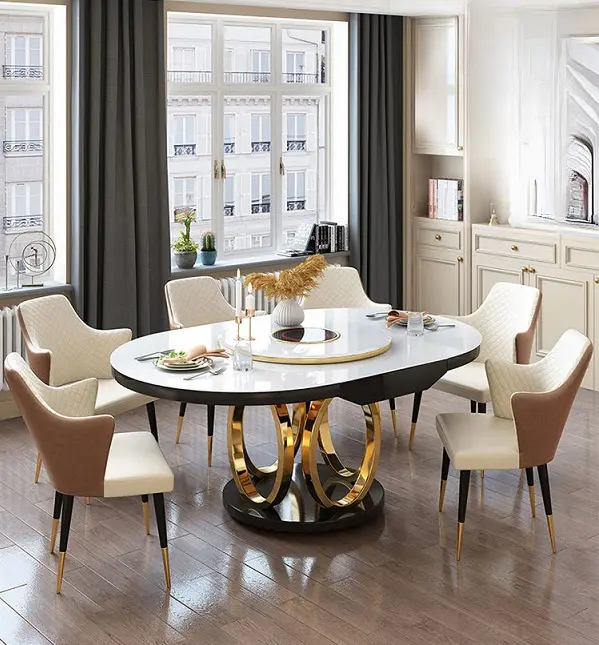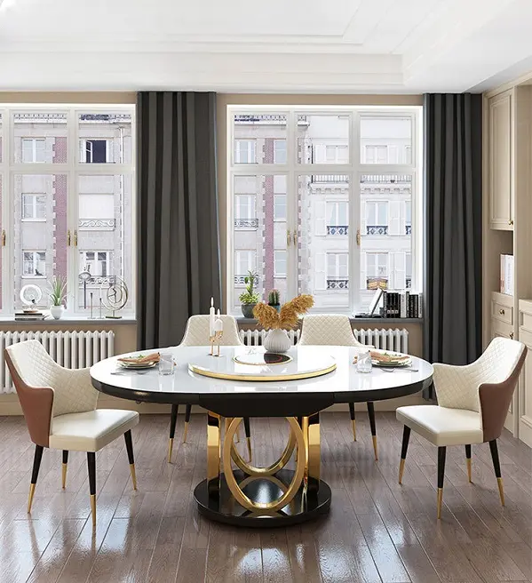 تمتاز بتصنيعها باستخدام الستيل المذهب الصلب، مما يعزز قوتها ومتانتها. يضيف سطحها الرخامي لمعانًا راقيًا ويعزز من جاذبيتها الجمالية. مع كرسي مغطي بجلد ايطالي فاخر وناعم ومبطن بالاسفنج عالي الكثافة واطار من هيكل صلب معدني ليتحمل لاقصي درجة . هذه الخامات الرائعة تجمع بين الأناقة والقوة، مما يجعل سفرة طعام اركان متينة وجاهزة لتحمل تحديات الاستخدام اليومي.