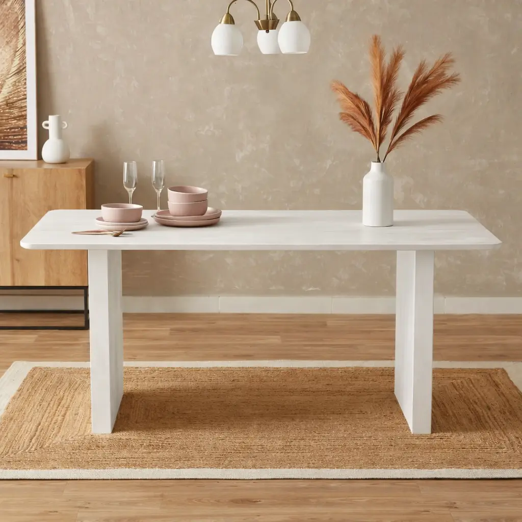 كما أن السطح العملي للطاولة مصمم ليقاوم الخدوش والبقع الناتجة عن الاستخدام المتكرر، وهو ما يجعلها مناسبة للاستخدام العائلي اليومي. هذه الميزة تساعد على الحفاظ على مظهر الطاولة مرتبًا داخل غرفة الطعام.