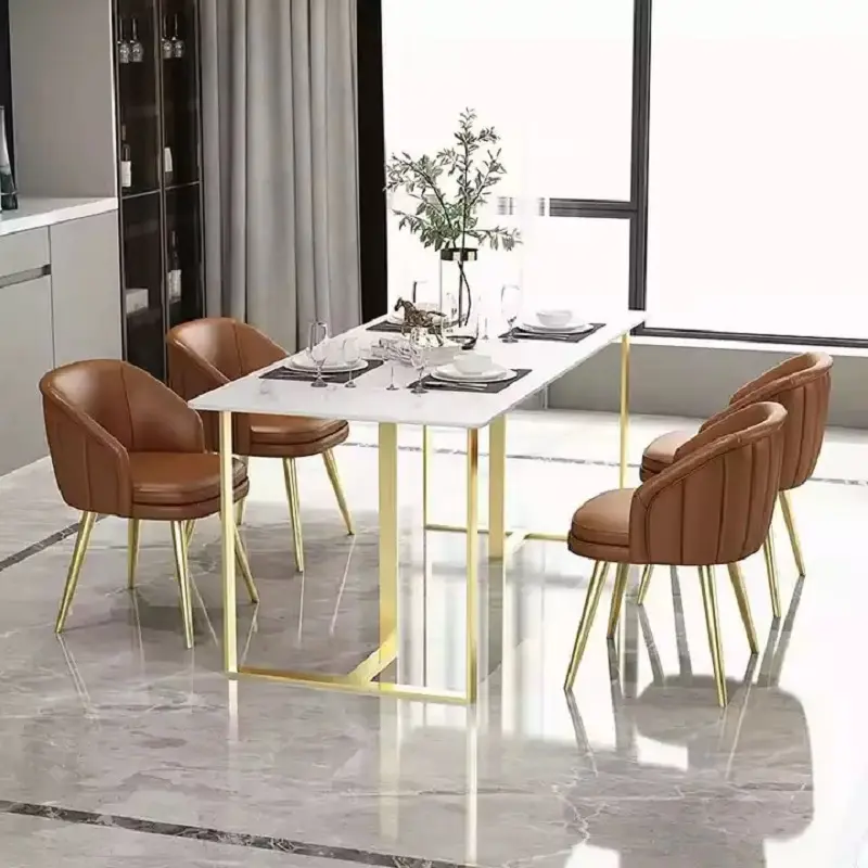 يعتمد هيكل الطاولة على قاعدة معدنية قوية تضمن الاستقرار ، بينما يأتي السطح من الرخام ليعكس الفخامة والمتانة في نفس الوقت الكراسي مصممة لتكمل الطاولة بشكل متناسق ، مما يجعلها خيارًا مناسبًا لمن يبحث عن طاولة طعام كبيرة بلمسة عصرية.