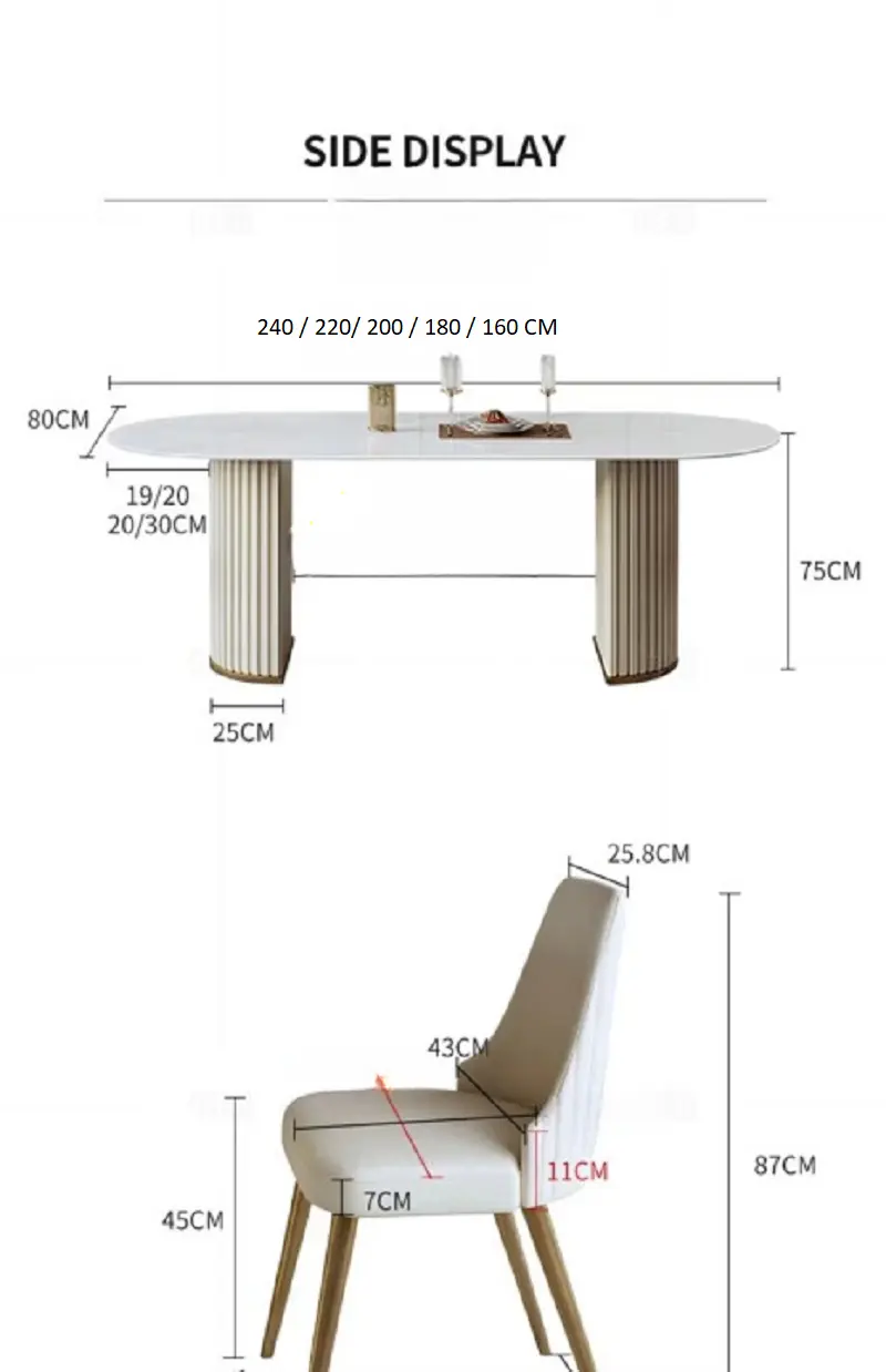 | المقاسات | طاولة طعام مقاس 160 سم مع 6 كراسى, طاولة طعام مقاس 180 سم مع 6 كراسى, طاولة طعام مقاس 200سم مع 8 كراسى, طاولة طعام مقاس 220 سم مع 10 كراسى, طاولة طعام مقاس 240 سم مع 10 كراسى |