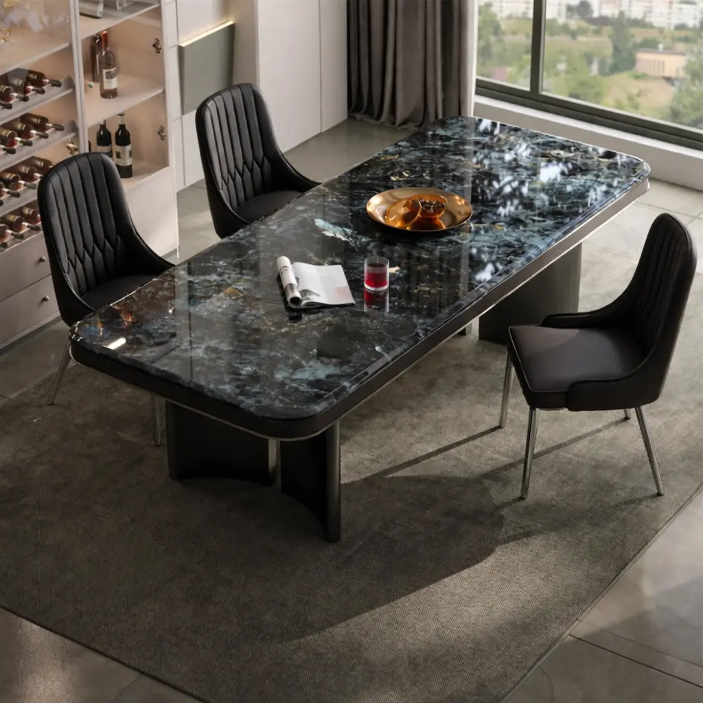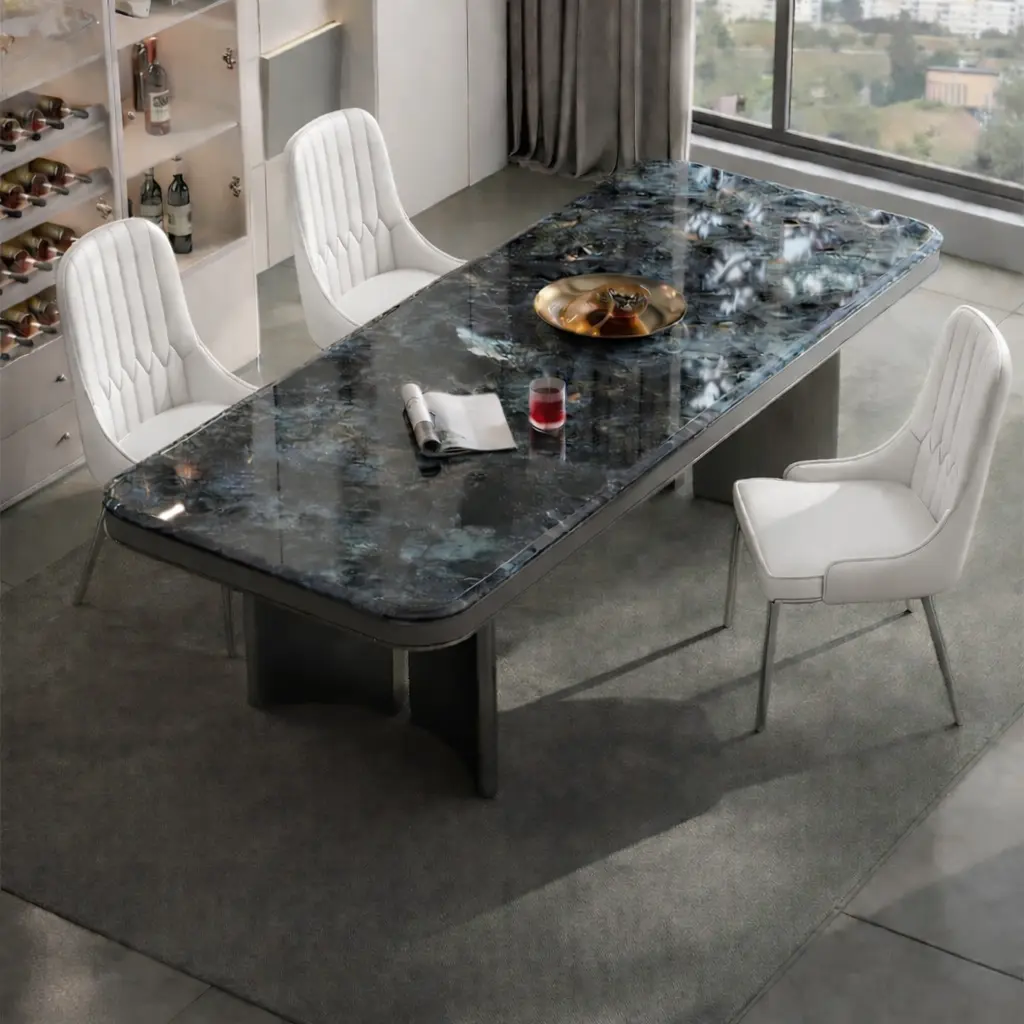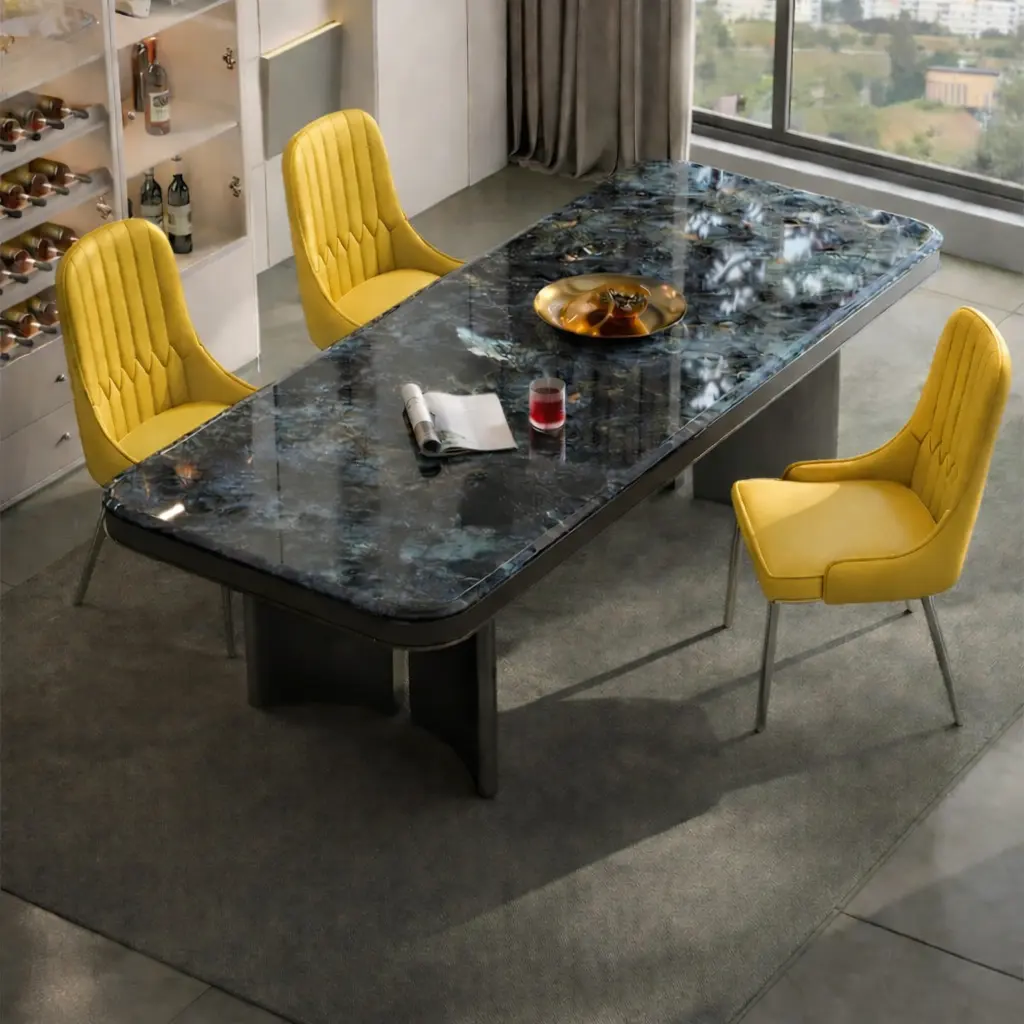 استمتع بفخامة الرخام مع طاولة طعامنا، حيث يأتي السطح الرخامي الصلب والمتين المقاوم للخدوش والصدمات ليمنح منزلك لمسة أنيقة وعصرية.