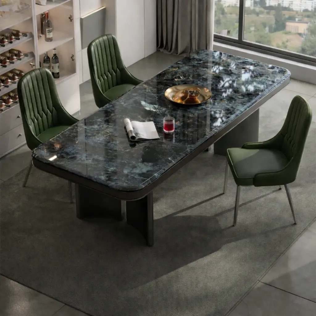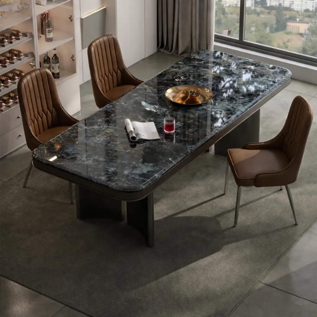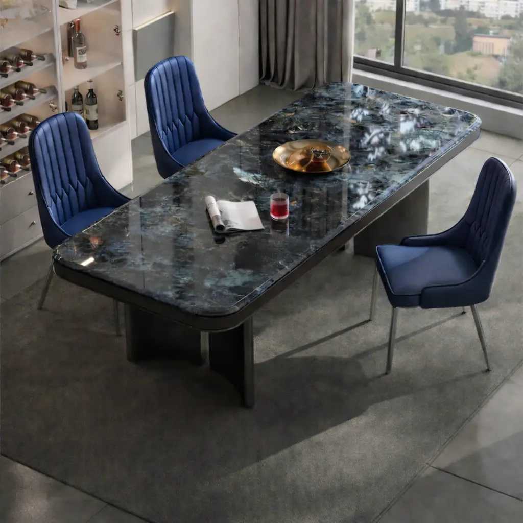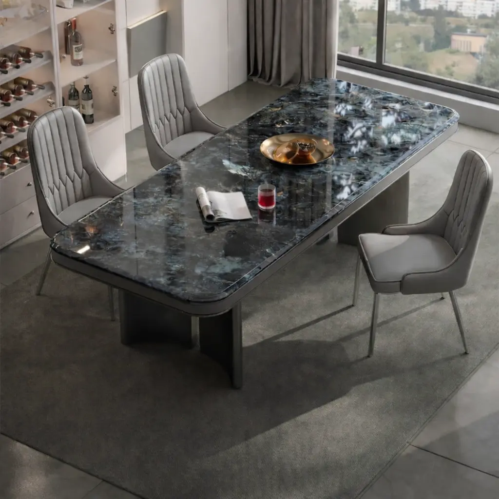 استمتع بفخامة الرخام مع طاولة طعامنا، حيث يأتي السطح الرخامي الصلب والمتين المقاوم للخدوش والصدمات ليمنح منزلك لمسة أنيقة وعصرية.