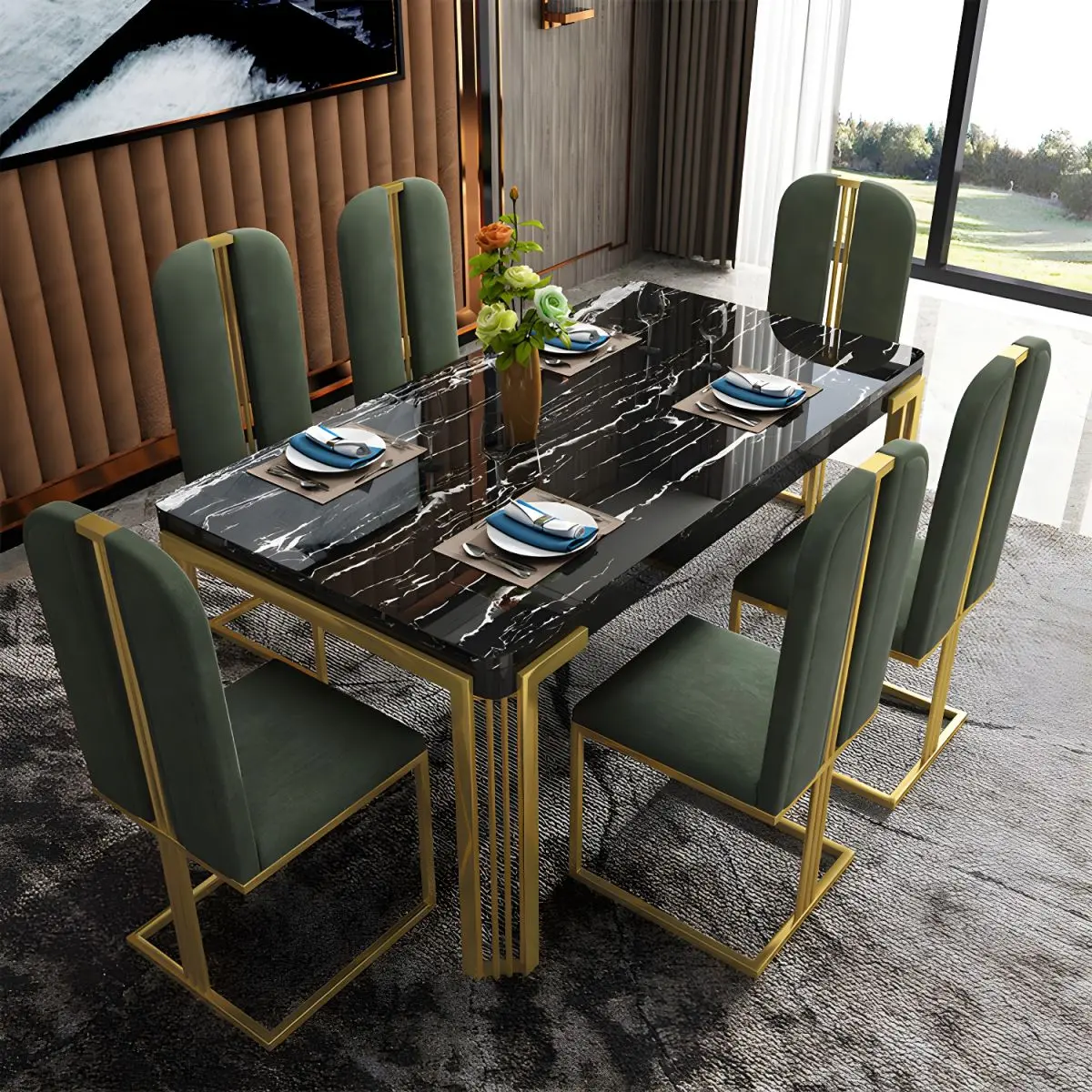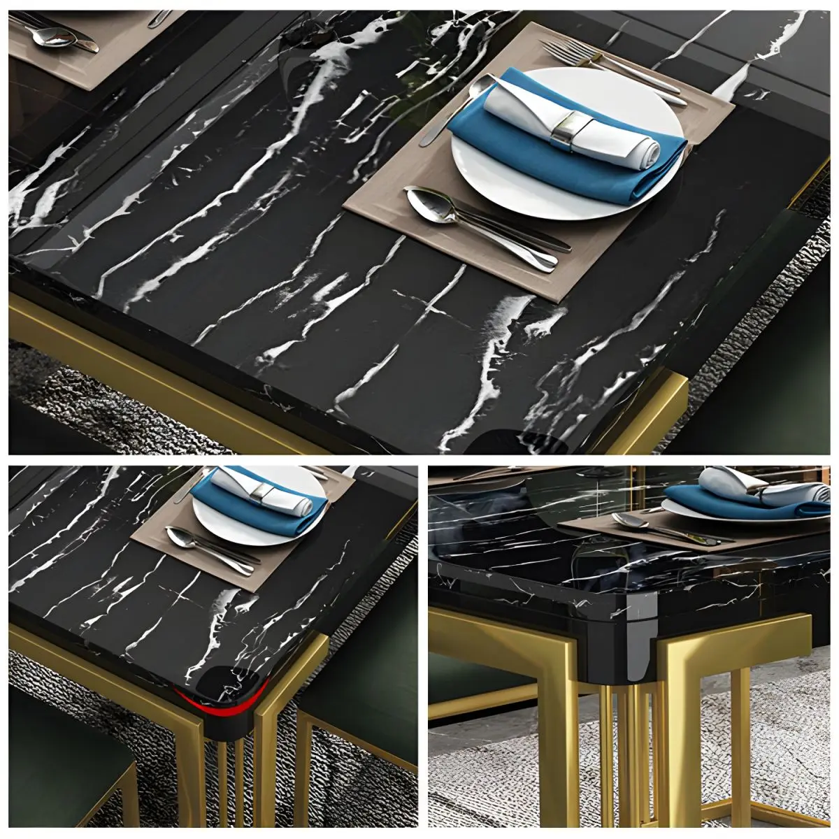 طاولة طعام رخام هذه تجمع بين قاعدة مصنوعة من الستيل المذهب الصلب بشكل أنيق وسطح رخامي فاخر. يضيف التصميم الذهبي للقاعدة لمسة من الرفاهية، و يأتي السطح الرخامي بخيارات للاختيار من بينها بيضاء أو سوداء، مما يتيح لك تنسيقها بسهولة مع ديكور منزلك.