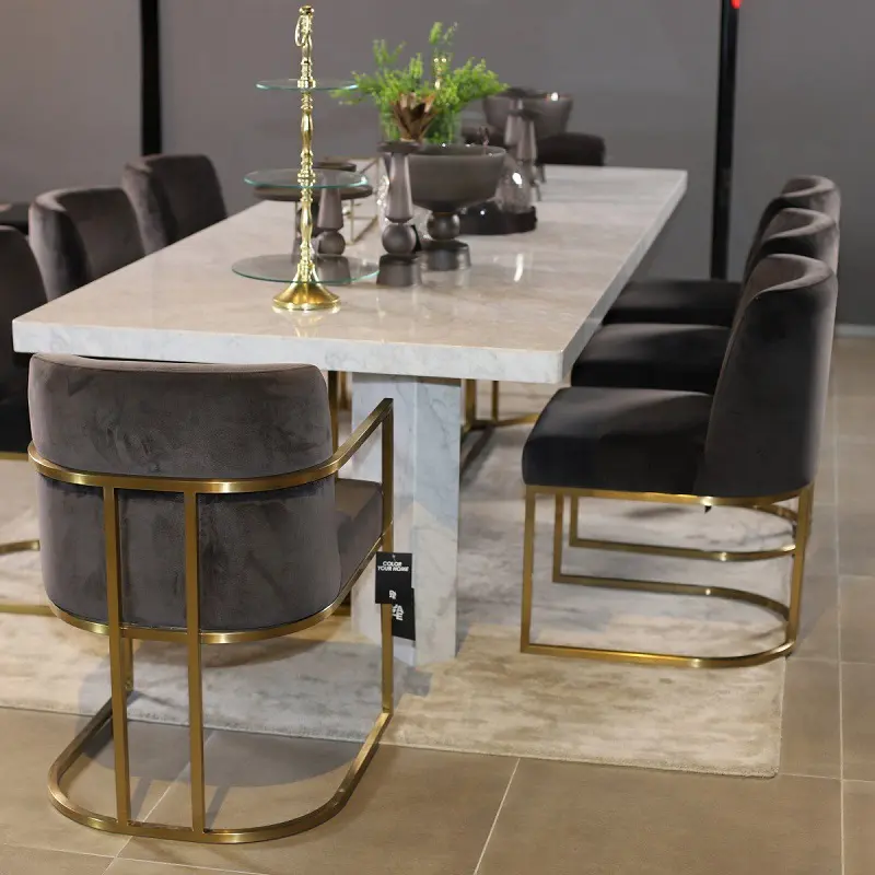 السطح الرخام يرفع من قيمة الشكل العام داخل الغرفة، وفي الوقت نفسه يساعد على إبراز أناقة المكان في المناسبات العائلية. أما القاعدة المعدنية فتمنح الطاولة حضورًا متوازنًا وثباتًا مهمًا عند الاستخدام المتكرر. لهذا يمكن اعتبارها خيارًا عمليًا لمن يبحث عن طاولة طعام 8 كراسي أو تنسيق قريب من هذا الاستخدام بحسب توزيع المساحة والكراسي المختارة.