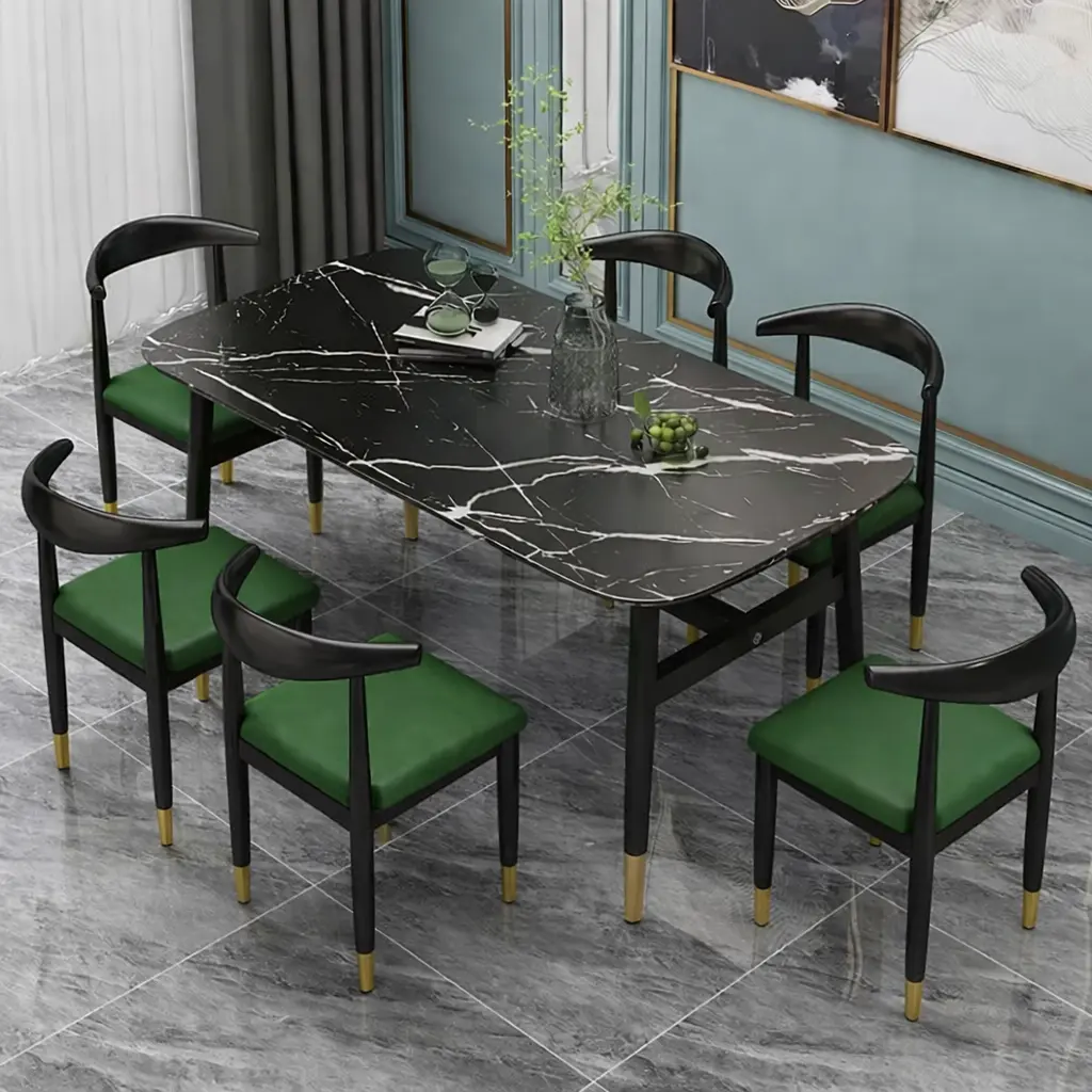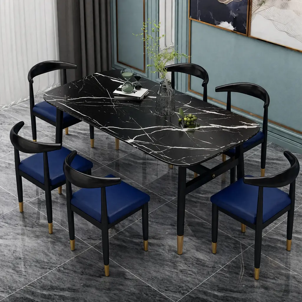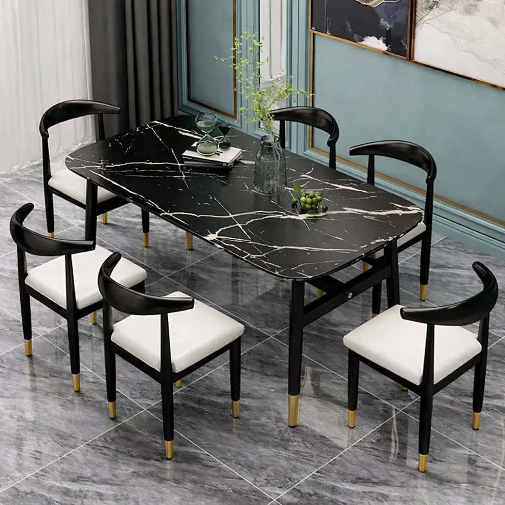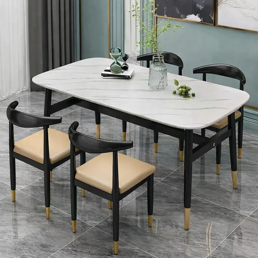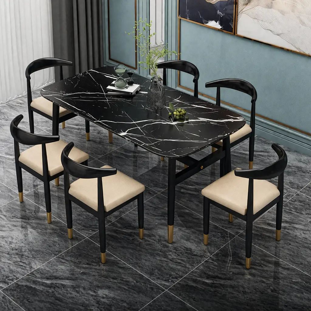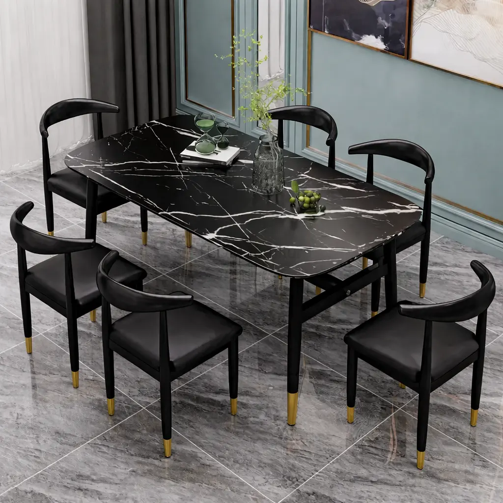 سطح الطاولة يأتي بتصميم رخامي يمنح المكان حضورًا مميزًا، بينما تضيف التفاصيل الدقيقة في القاعدة إحساسًا بالثبات والجودة. هذا يجعلها مناسبة للاستخدام اليومي وكذلك عند استقبال الضيوف، حيث توفر تجربة جلوس مريحة وتنظيمًا عمليًا للمائدة.