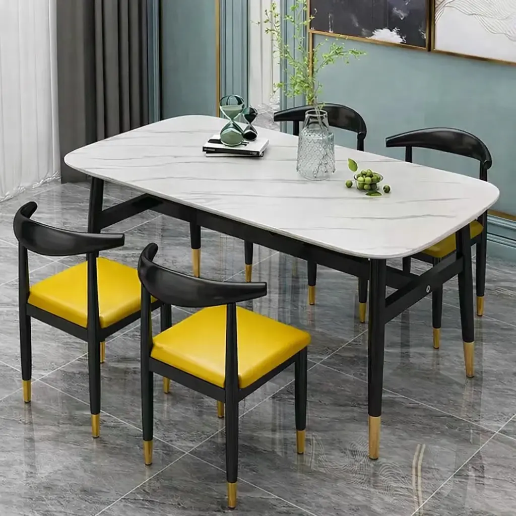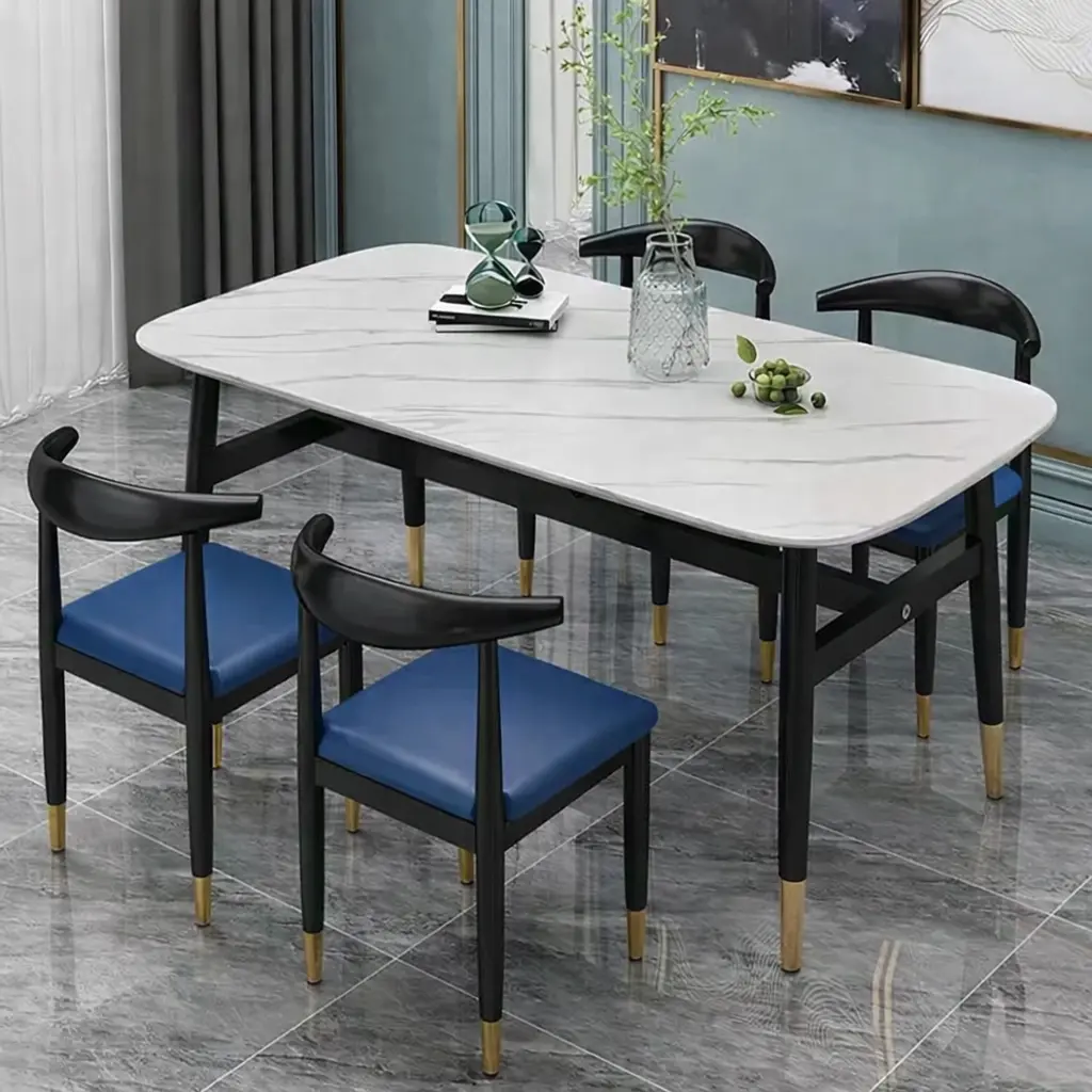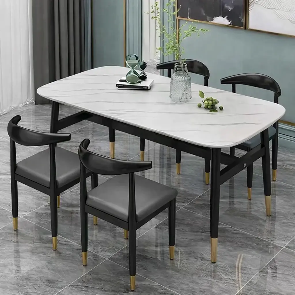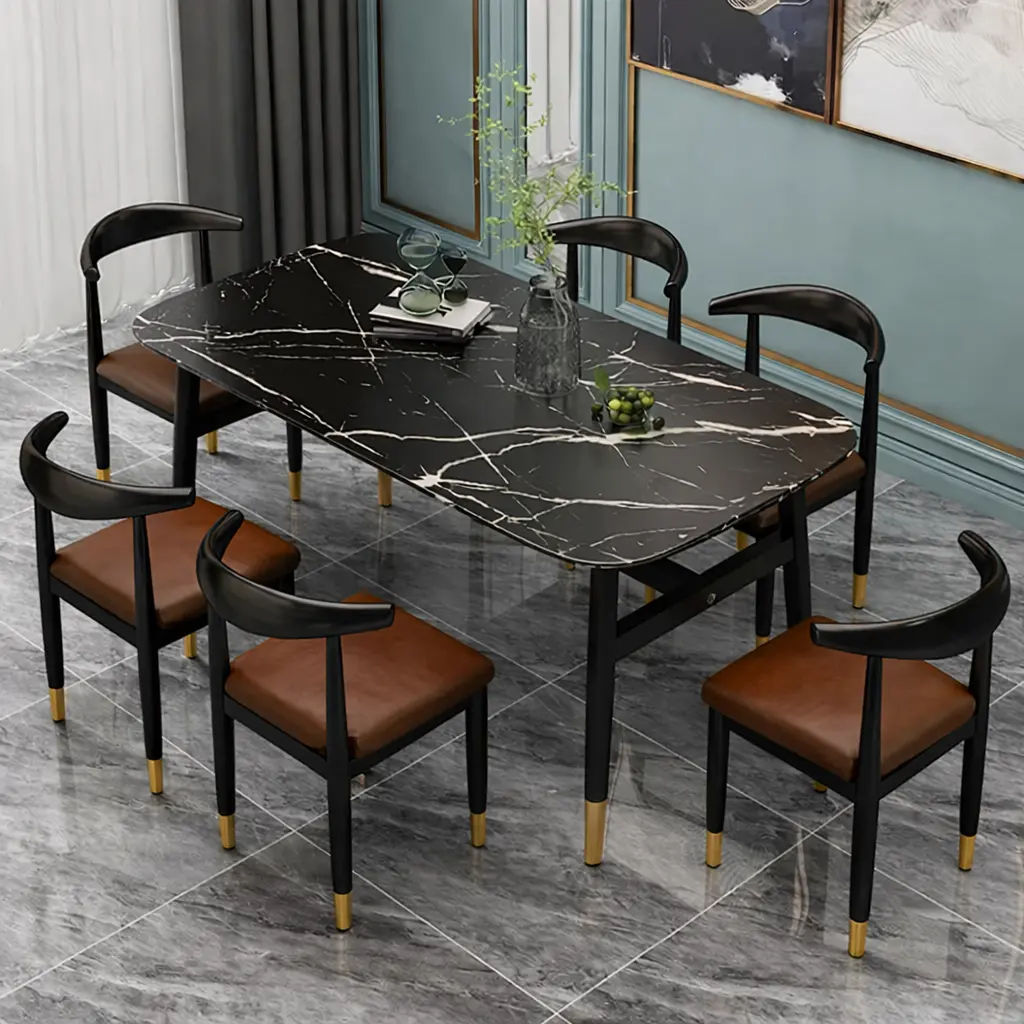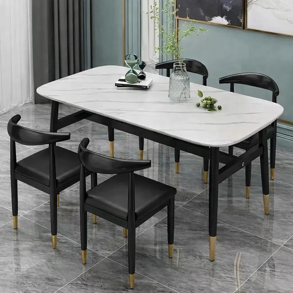 سطح الطاولة يأتي بتصميم رخامي يمنح المكان حضورًا مميزًا، بينما تضيف التفاصيل الدقيقة في القاعدة إحساسًا بالثبات والجودة. هذا يجعلها مناسبة للاستخدام اليومي وكذلك عند استقبال الضيوف، حيث توفر تجربة جلوس مريحة وتنظيمًا عمليًا للمائدة.