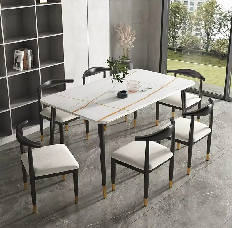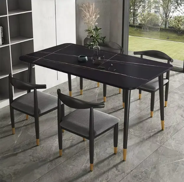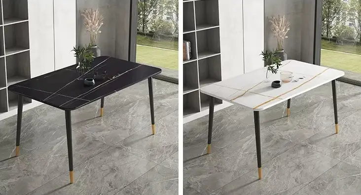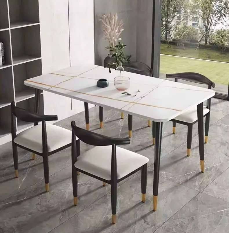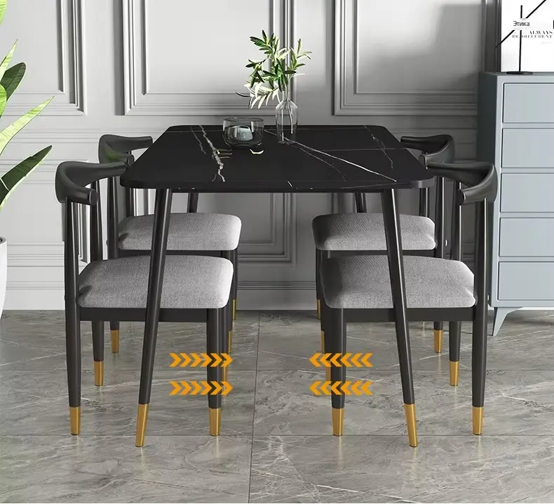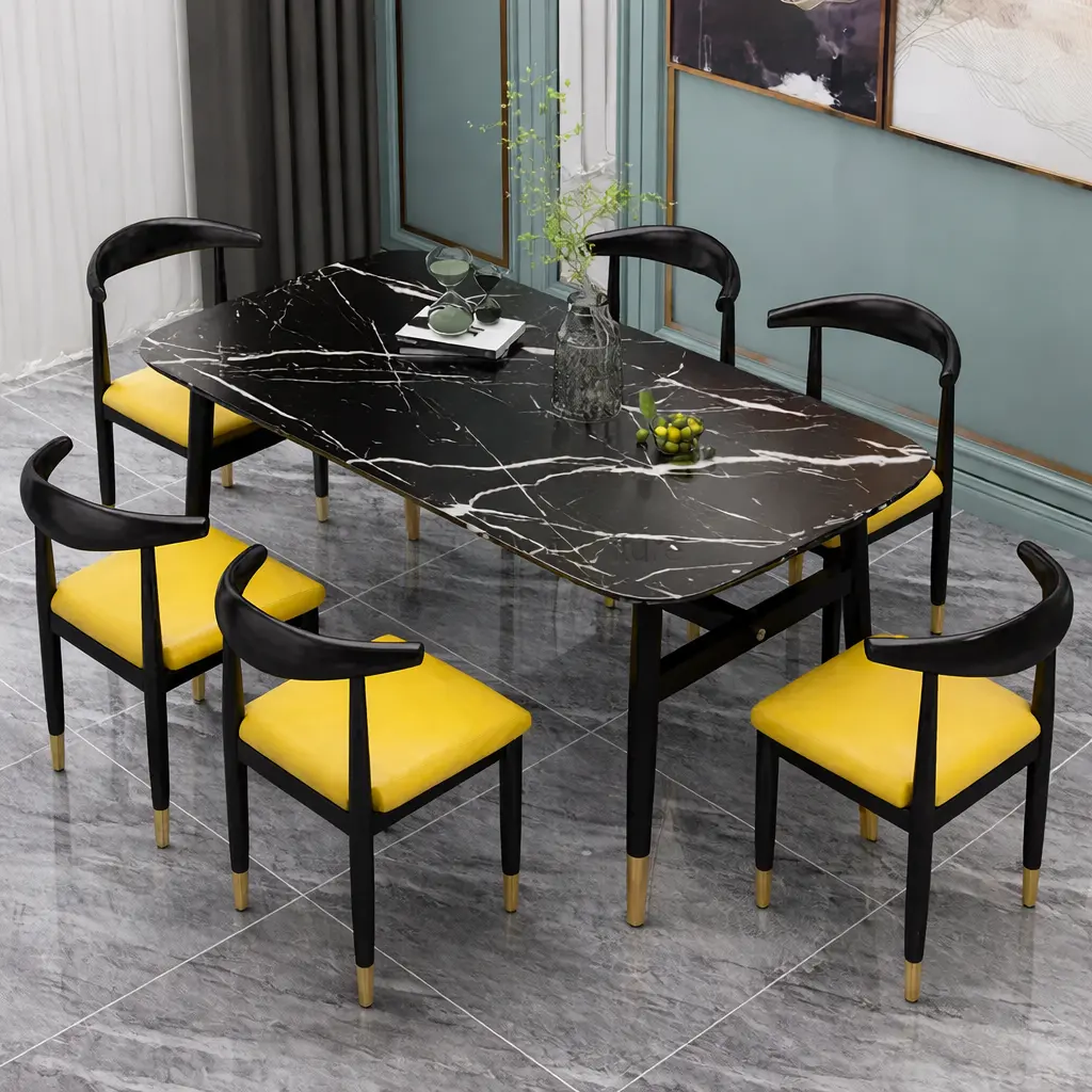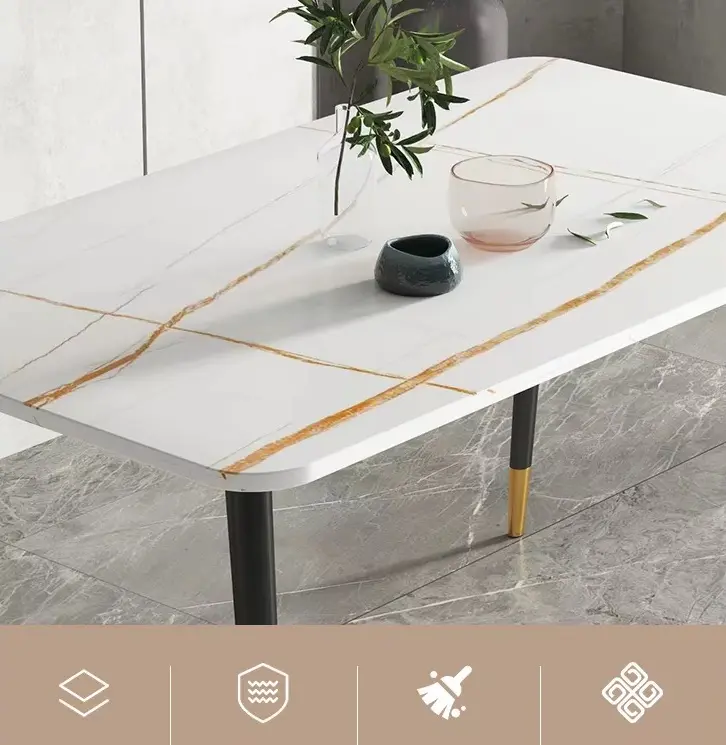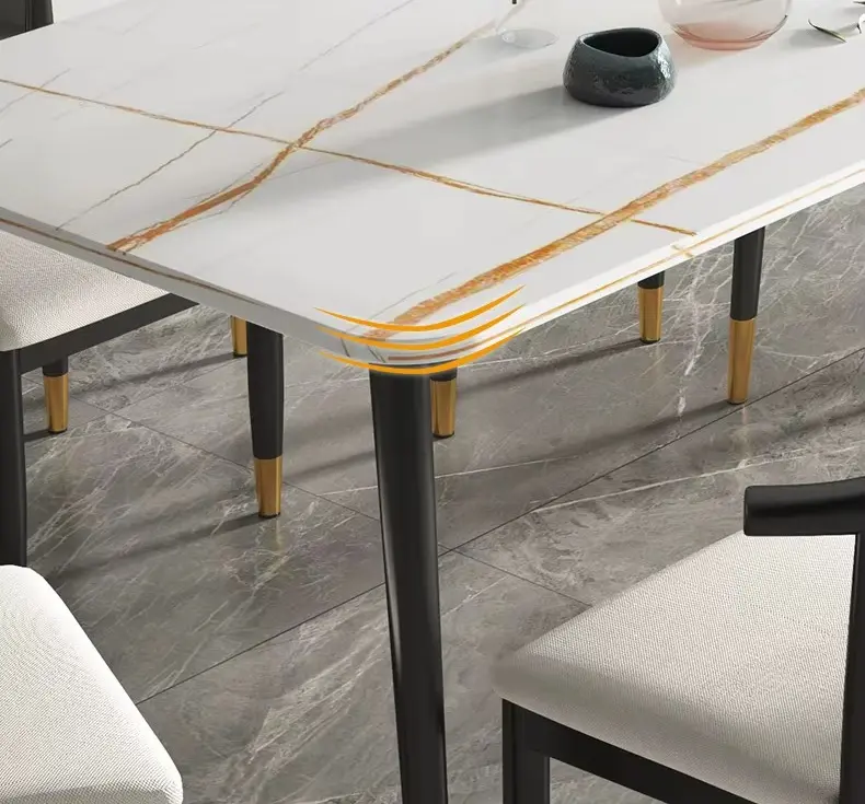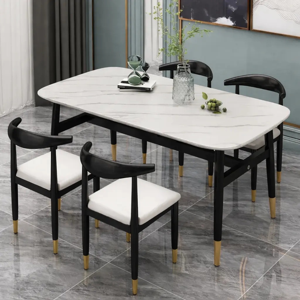 سطح الطاولة يأتي بتصميم رخامي يمنح المكان حضورًا مميزًا، بينما تضيف التفاصيل الدقيقة في القاعدة إحساسًا بالثبات والجودة. هذا يجعلها مناسبة للاستخدام اليومي وكذلك عند استقبال الضيوف، حيث توفر تجربة جلوس مريحة وتنظيمًا عمليًا للمائدة.