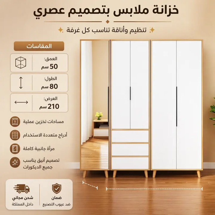 هذه الخزانة مصممة لتكون خيارًا عمليًا داخل غرفة النوم، وتساعد على ترتيب الملابس بشكل واضح وسهل في الاستخدام اليومي. ويمنحها التصميم الجذاب حضورًا مرتبًا داخل المساحة، لذلك تعد مناسبة لمن يبحث عن خزانة ملابس تجمع بين المظهر الهادئ والاستفادة الفعلية من المكان. كما أن توزيعها العملي يجعلها مناسبة للاستخدام اليومي في البيوت التي تحتاج إلى تنظيم مستمر بدون تعقيد.