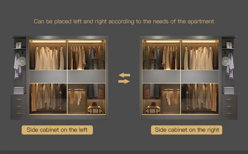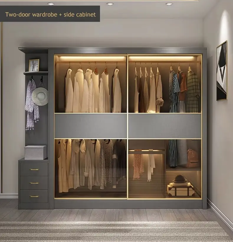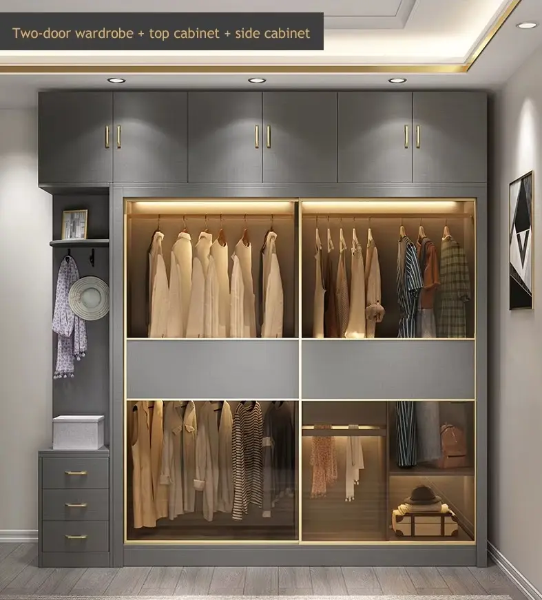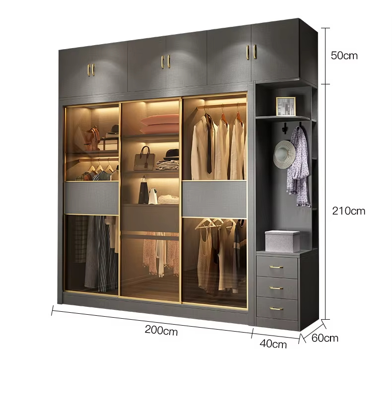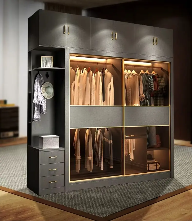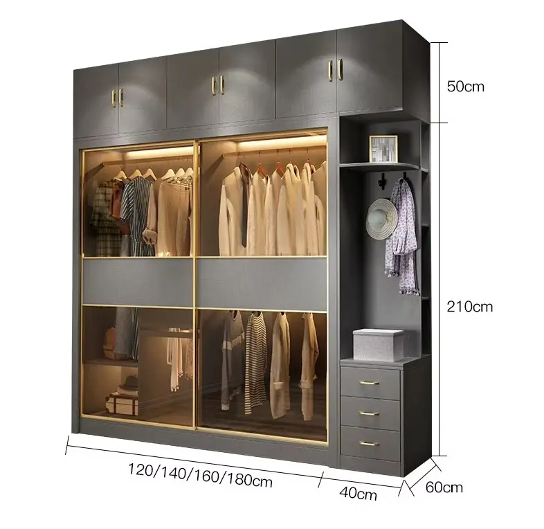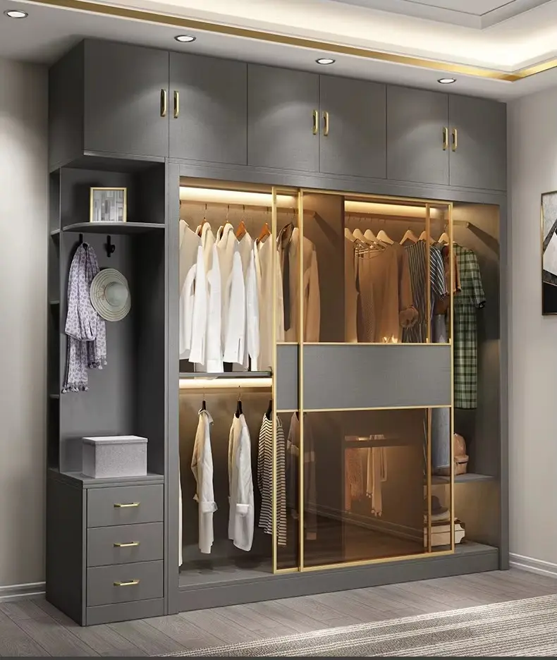 تأتي خزانة الملابس بلون رمادي غامق مميز مع تفاصيل ذهبية فاخرة. الزجاج الشفاف الملون يعزز من جمال اللون ويخلق تأثيرًا بصريًا رائعًا.