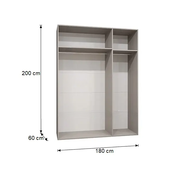 تأتي الخزانة بأبعاد مدروسة تناسب الاستخدام داخل غرف النوم المتوسطة والكبيرة، حيث يبلغ الارتفاع 200 سم، والعمق 60 سم، والعرض 180 سم. هذه المقاسات توفر سعة تخزين مناسبة دون التأثير الكبير على المساحة العامة للغرفة.