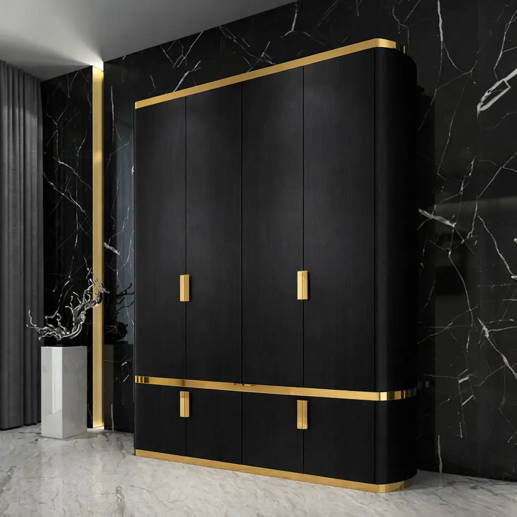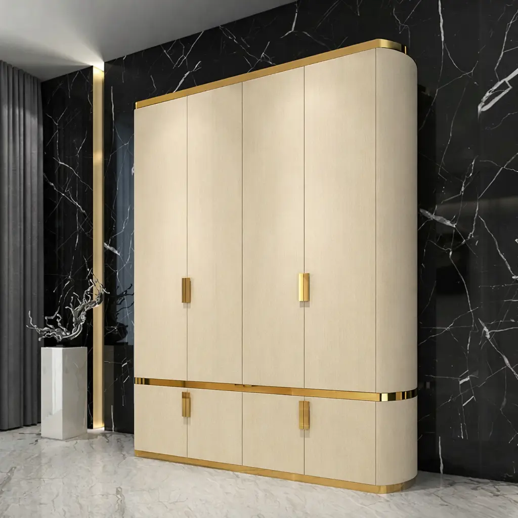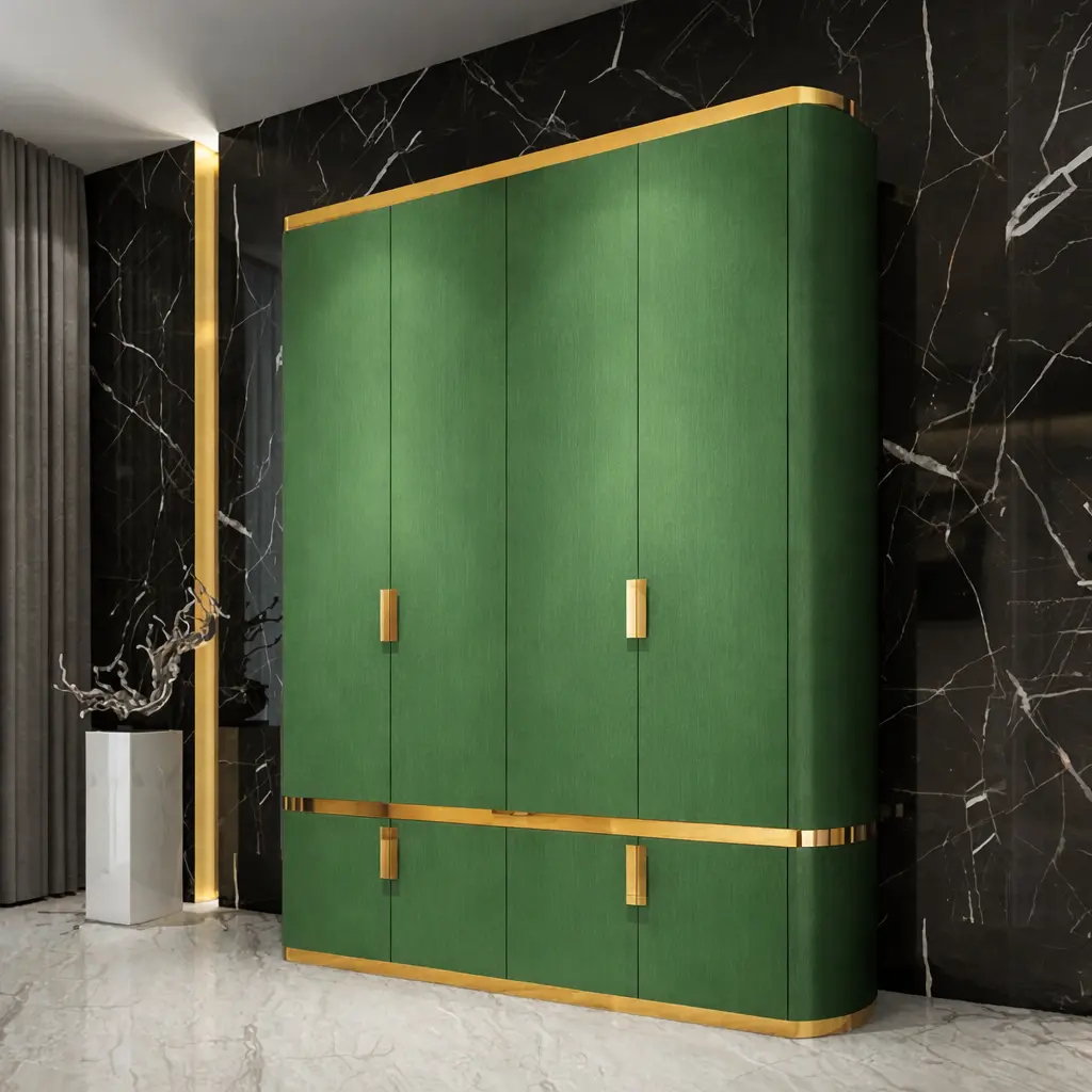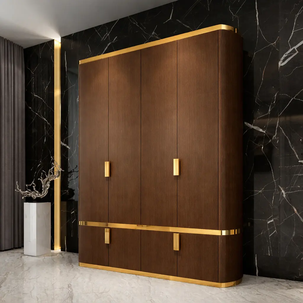 هذا الدمج بين الخشب والتفاصيل المعدنية يمنح الخزانة مظهرًا فخمًا مع الحفاظ على العملية في الاستخدام اليومي.