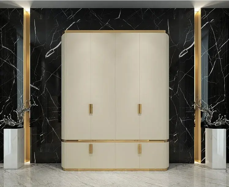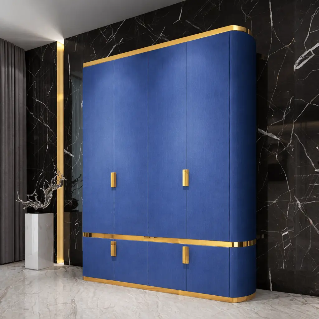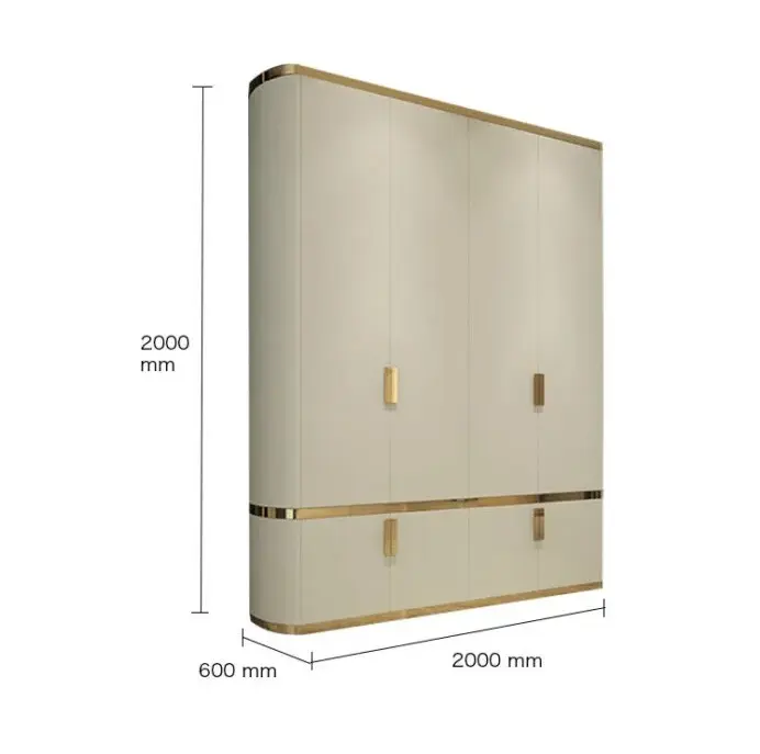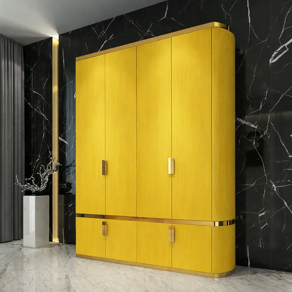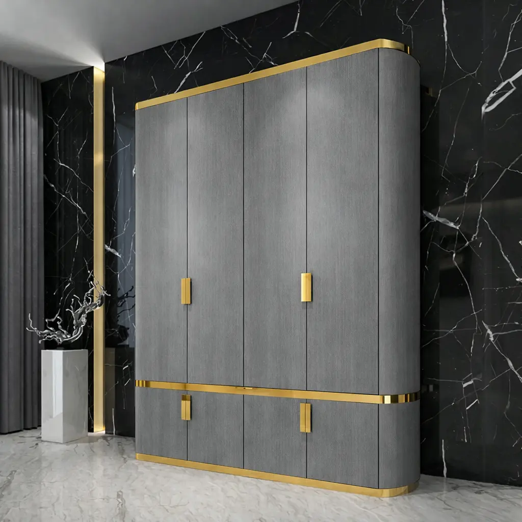 هذا الدمج بين الخشب والتفاصيل المعدنية يمنح الخزانة مظهرًا فخمًا مع الحفاظ على العملية في الاستخدام اليومي.