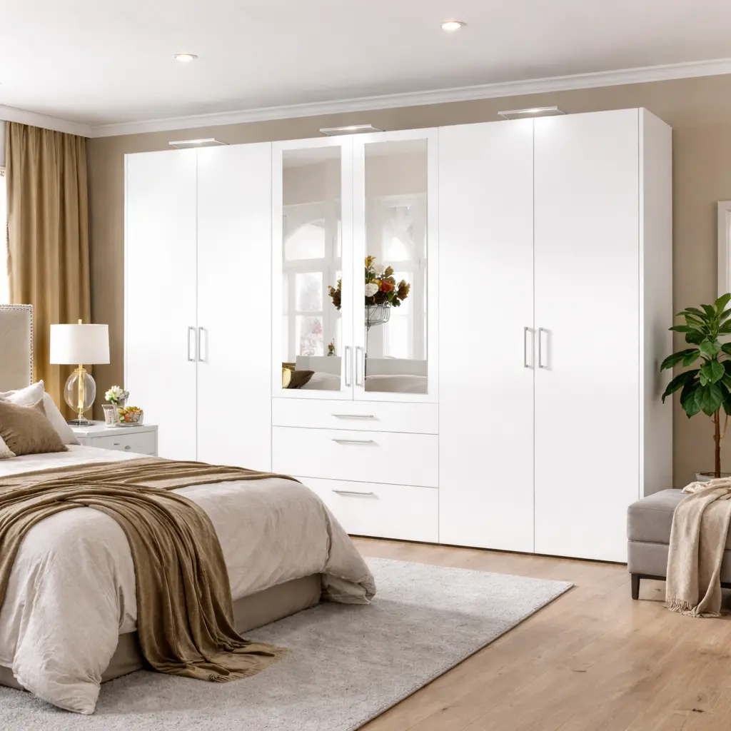 اللون الأبيض المستخدم في الخزانة يضفي لمسة من النقاء والبساطة، كما يعزز من إحساس الاتساع داخل الغرفة، خاصةً عند استخدامه مع الديكورات ذات الألوان المحايدة أو الألوان الترابية الدافئة، الشائعة في المنازل الخليجية.