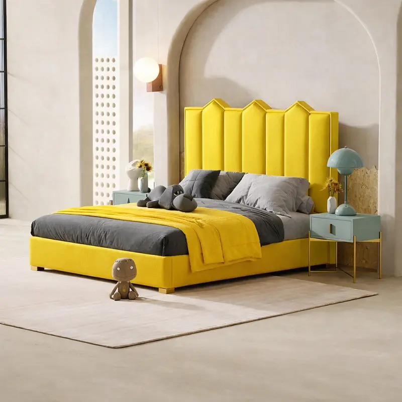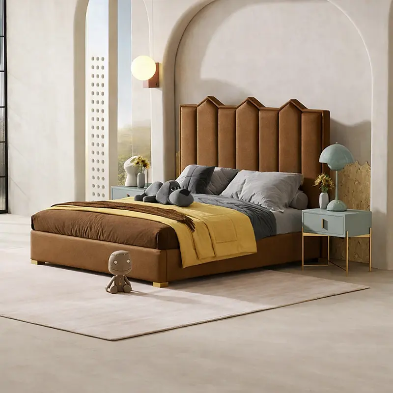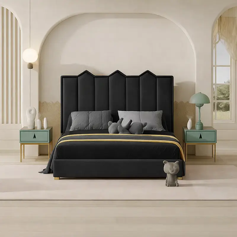 خلفية السرير مصممة بأسلوب هولستر مبطن بشكل ناعم، تمنحك دعامة مريحة للظهر أثناء الجلوس، مع مظهر فاخر يضفي إحساسًا بالدفء والفخامة على غرفة النوم. التصميم العصري يناسب الأذواق الحديثة، ويعزز من جمال ديكور الغرفة دون مبالغة.