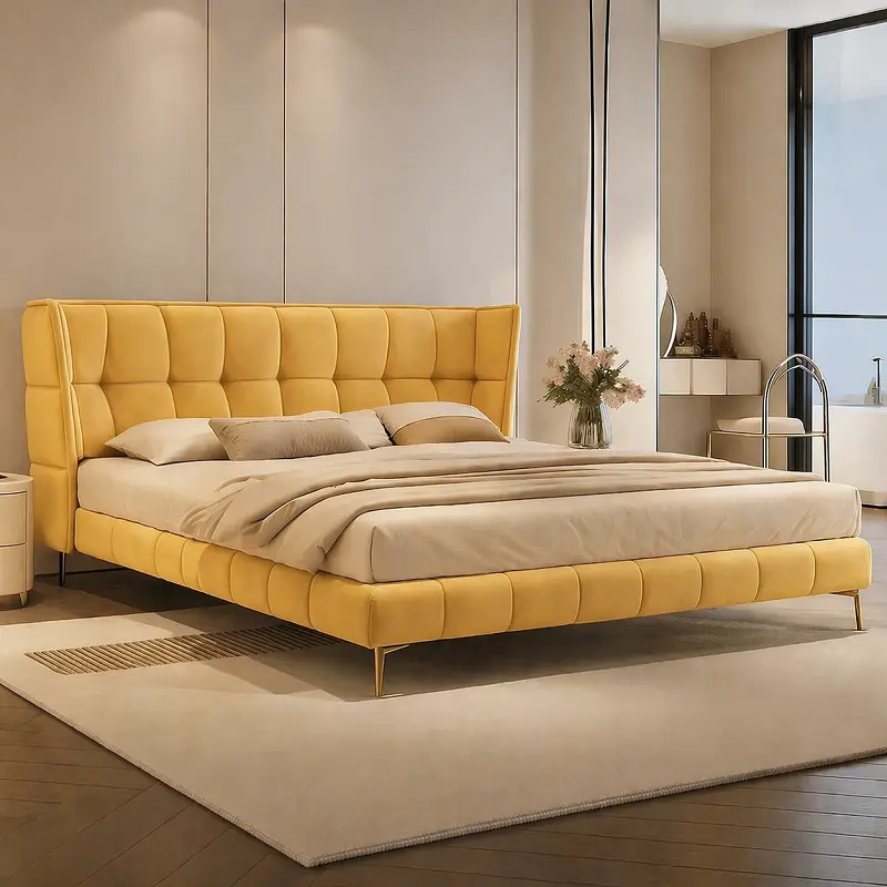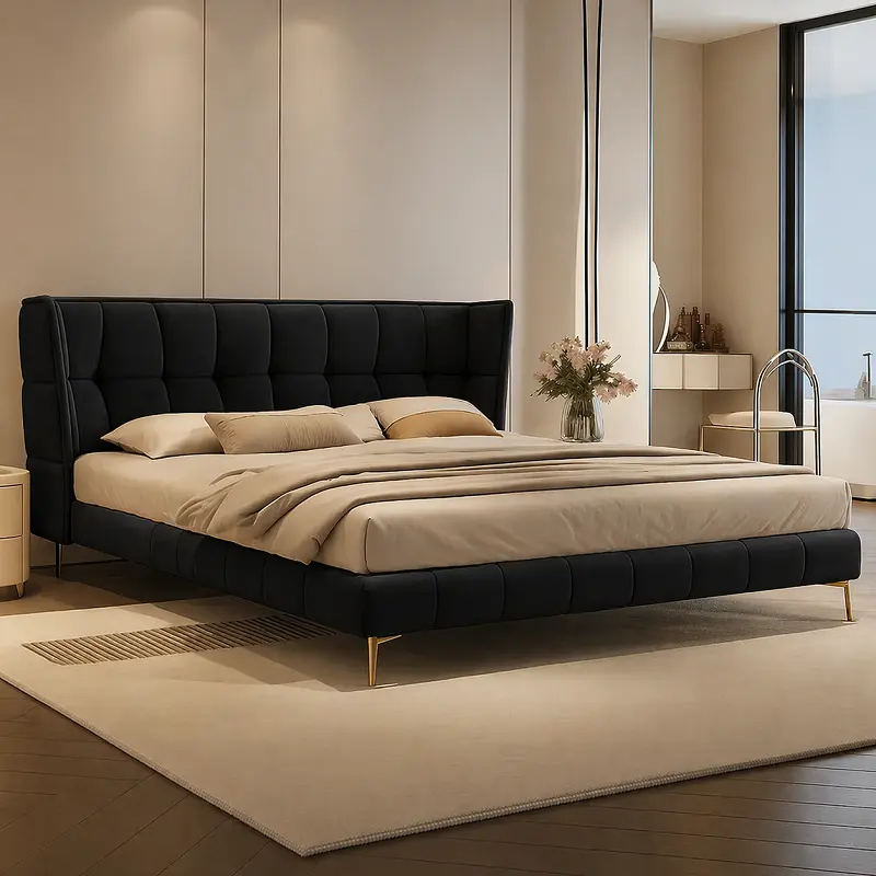مصنوع من هيكل مصنع من خشبي هندسي وخشب زان روماني عالي الجودة مغطي بالقماش المخملي الناعم والمريح المبطن بالاسفنج عالي الكثافة، ليمنحك نومًا هانئًا وراحة لا مثيل لها
