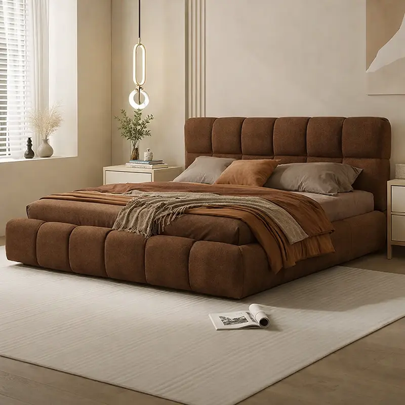 سرير نوم مزدوج بتصميم بسيط من الجلد، يضفي لمسة فاخرة لغرفة النوم. مصنوع من خشب هندسي وخشب زان روماني عالي الجودة، ومحشو بإسفنج عالي الجودة لراحة قصوى. مغطى بجلد إيطالي فاخر، سهل التنظيف بمسحة بسيطة. يتوفر بثلاثة مقاسات: 150 سم، 180 سم، و200 سم. يأتي بمجموعة متنوعة من الألوان مع ضمان سنتين ضد عيوب التصنيع.