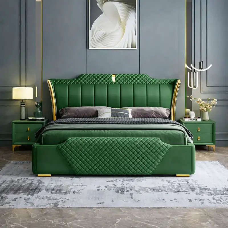 التنجيد: الجلد الفاخر المستخدم في تغطية الظهر والجانبين يمنح السرير مظهرًا راقيًا وسهل التنظيف.