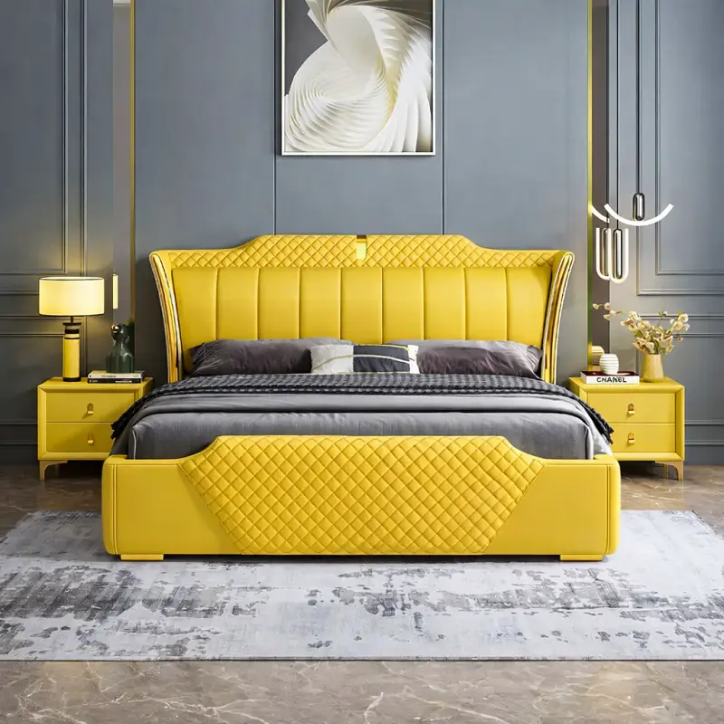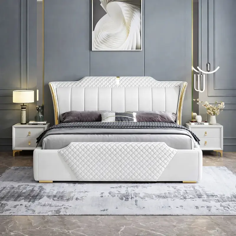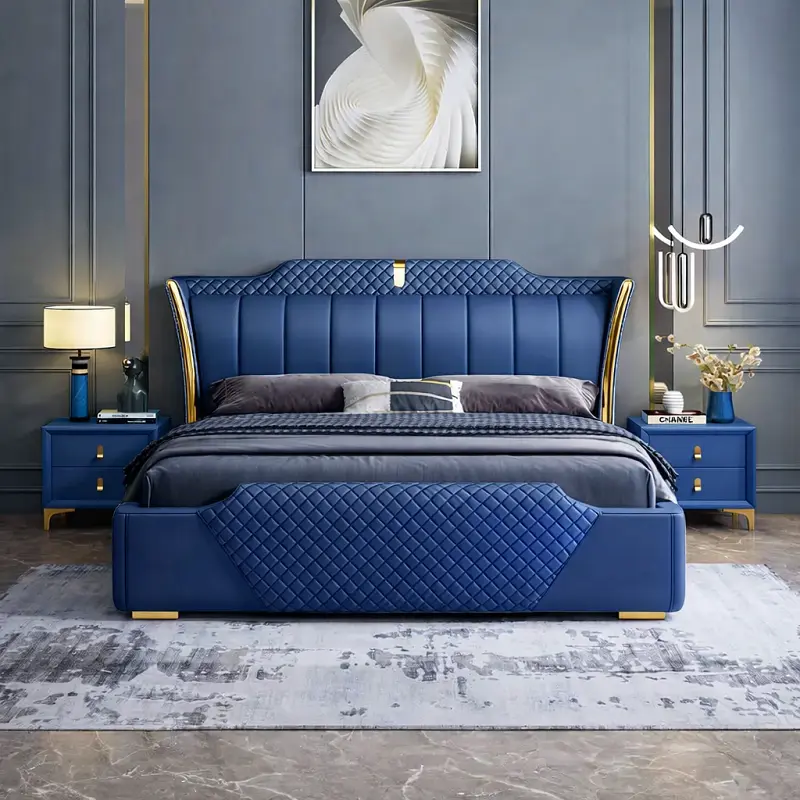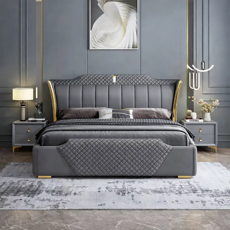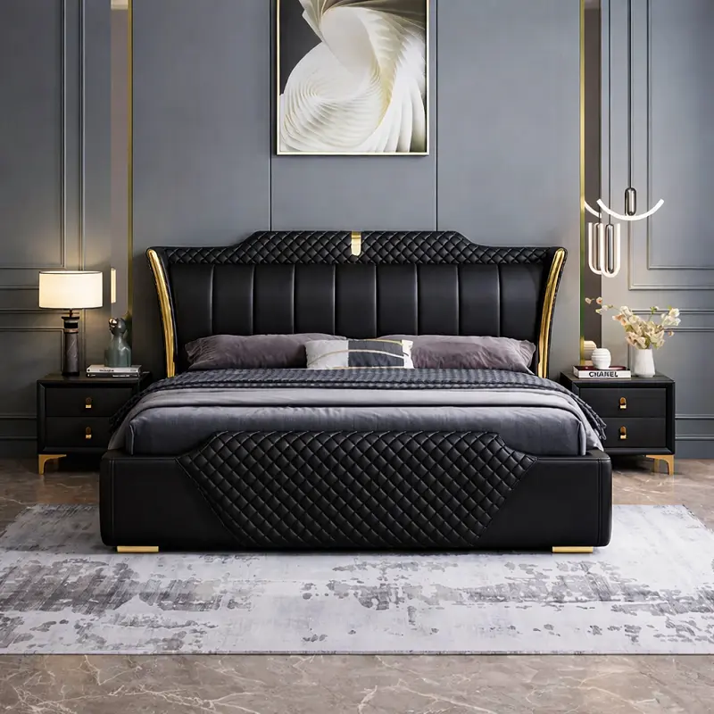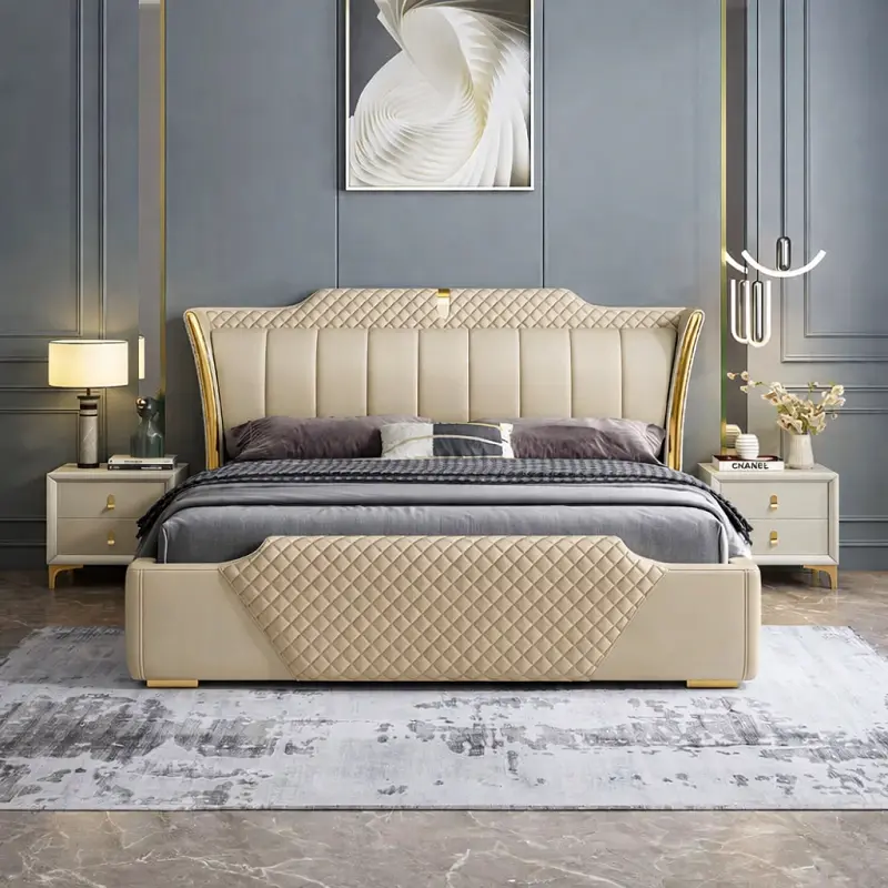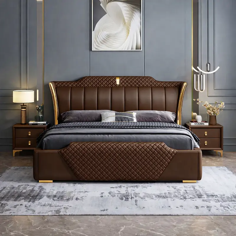 يجمع السرير بين الهيبة الملكية واللمسات العصرية التي تعزز من جمالية غرفة النوم. يأتي بظهر مرتفع مغطى بجلد فاخر ومبطن بإسفنج عالي الكثافة لضمان أقصى درجات الراحة والدعم أثناء الجلوس أو النوم. الخطوط الخارجية مصممة بإتقان لخلق توازن بصري يضفي لمسة فنية على ديكور الغرفة.