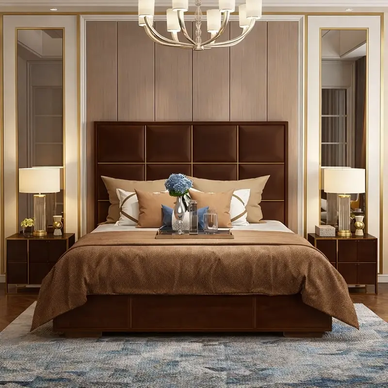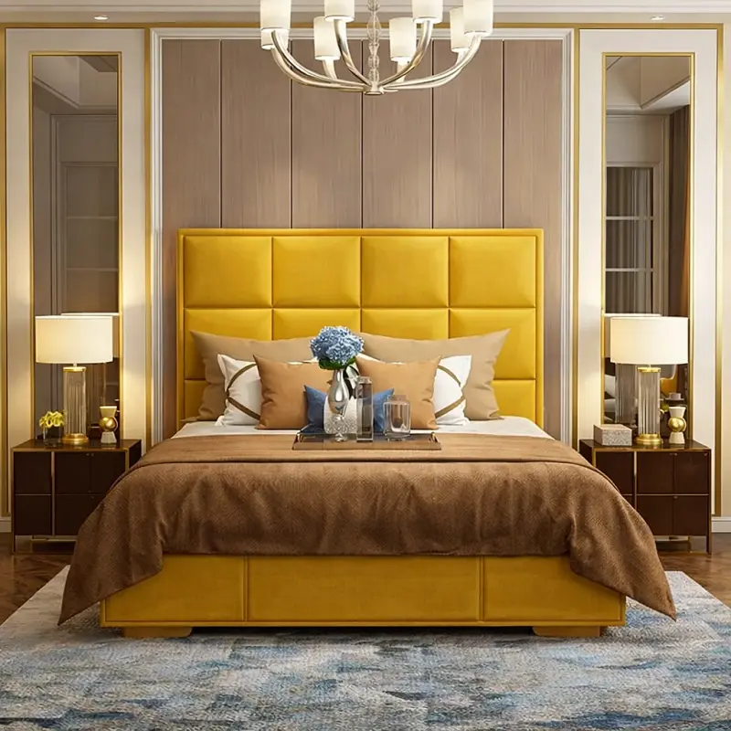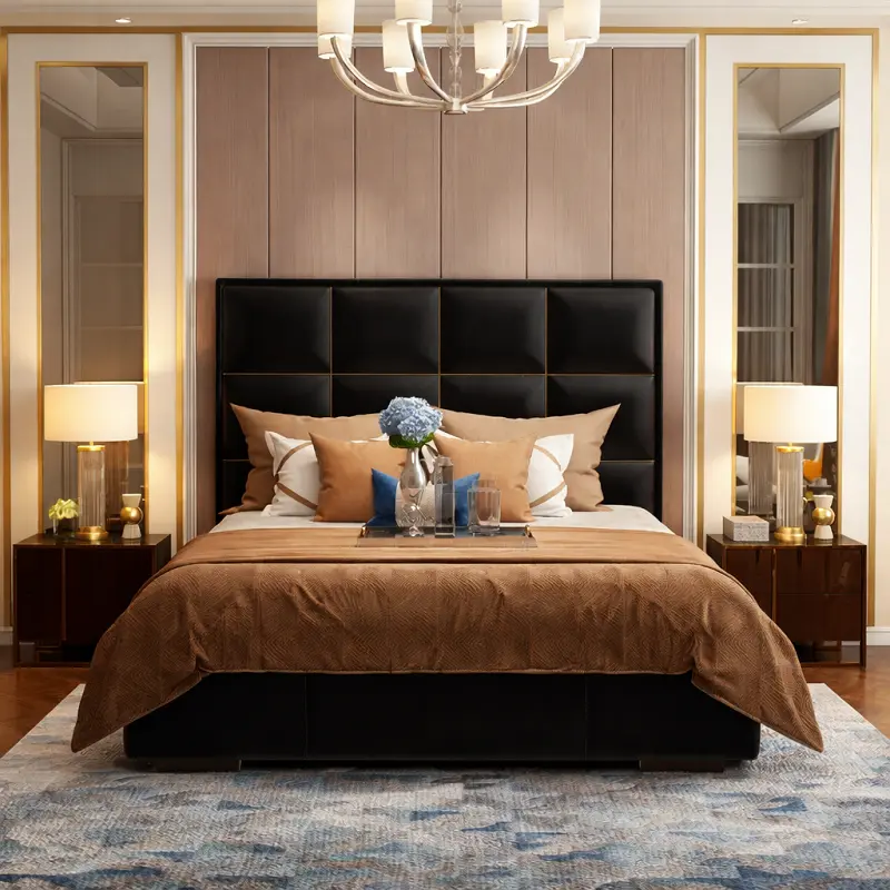 السرير مبطن بالكامل بـ إسفنج عالي الكثافة، مما يضمن تجربة نوم مريحة وداعمة للجسم. كما أن الطبقة الخارجية مغطاة بـ جلد ناعم فخم مقاوم للتمزق، يعطي إحساسًا فخمًا ويعزز من مظهر السرير العام، ويضيف لمسة راقية تتناغم بسهولة مع مختلف أنماط المفروشات والديكورات.