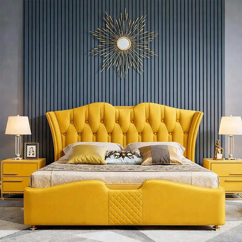 يتميز السرير بتصميم أنيق ومتقن، مع تفاصيل مطرزة بدقة وعناية، وتداخل مع الشرائط الذهبية المقاومة للصدأ لإضفاء مظهر فاخر وأنيق.