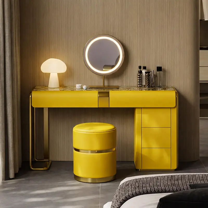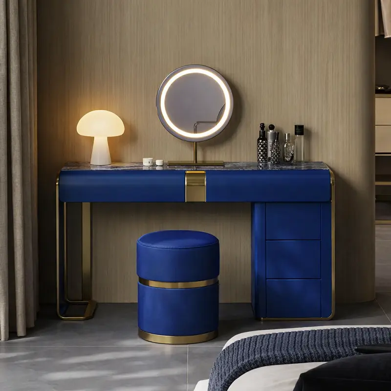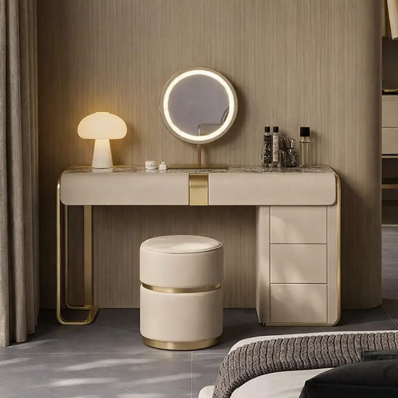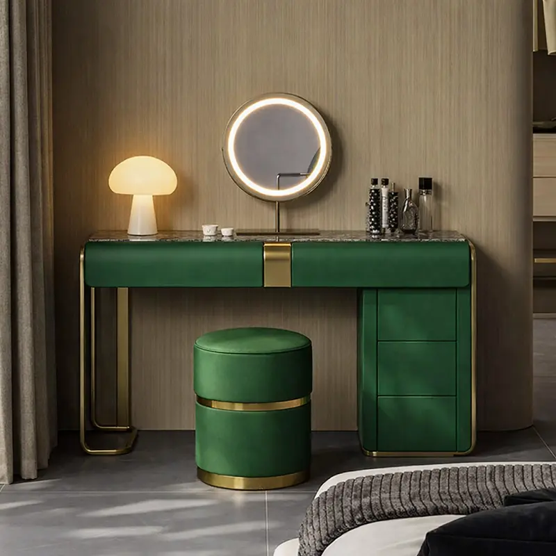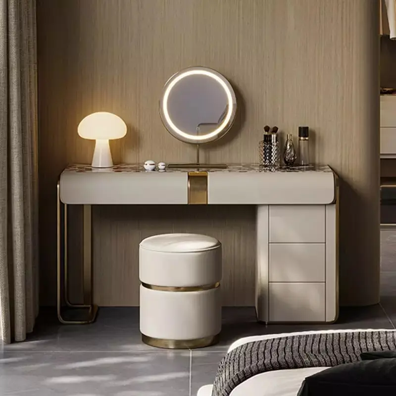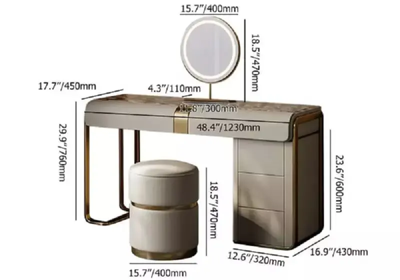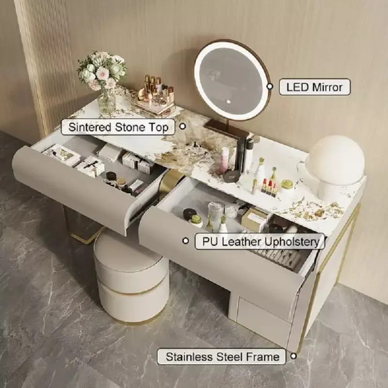 يتضمن الطقم أيضاً كرسي طاولة تسريحة مبطن بالجلد الإيطالي الفاخر ومبطن بالإسفنج عالي الكثافة والمرونة، مما يوفر لك راحة استثنائية أثناء الاستخدام. تصميم الكرسي يجمع بين الجمال والراحة، مما يجعله قطعة مثالية للاستخدام اليومي.